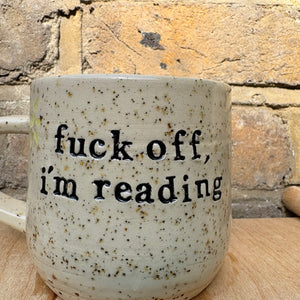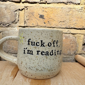 Five yellow suns and imprinted with words "fuck off i'm reading" on side