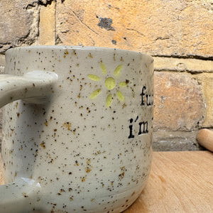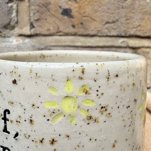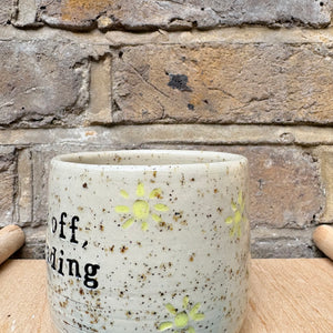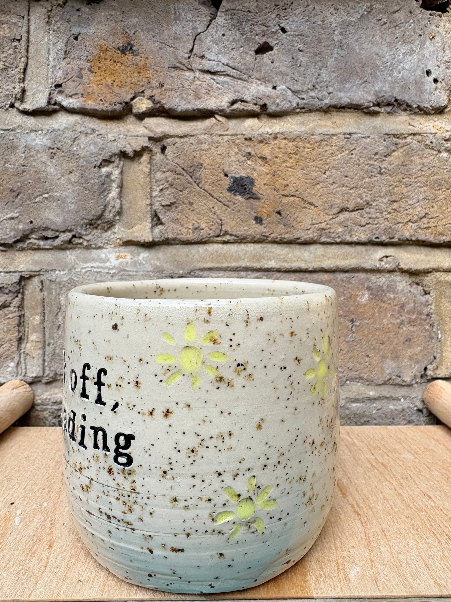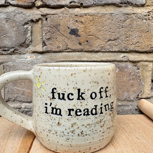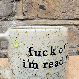 Five yellow suns and imprinted with words "fuck off i'm reading" on side