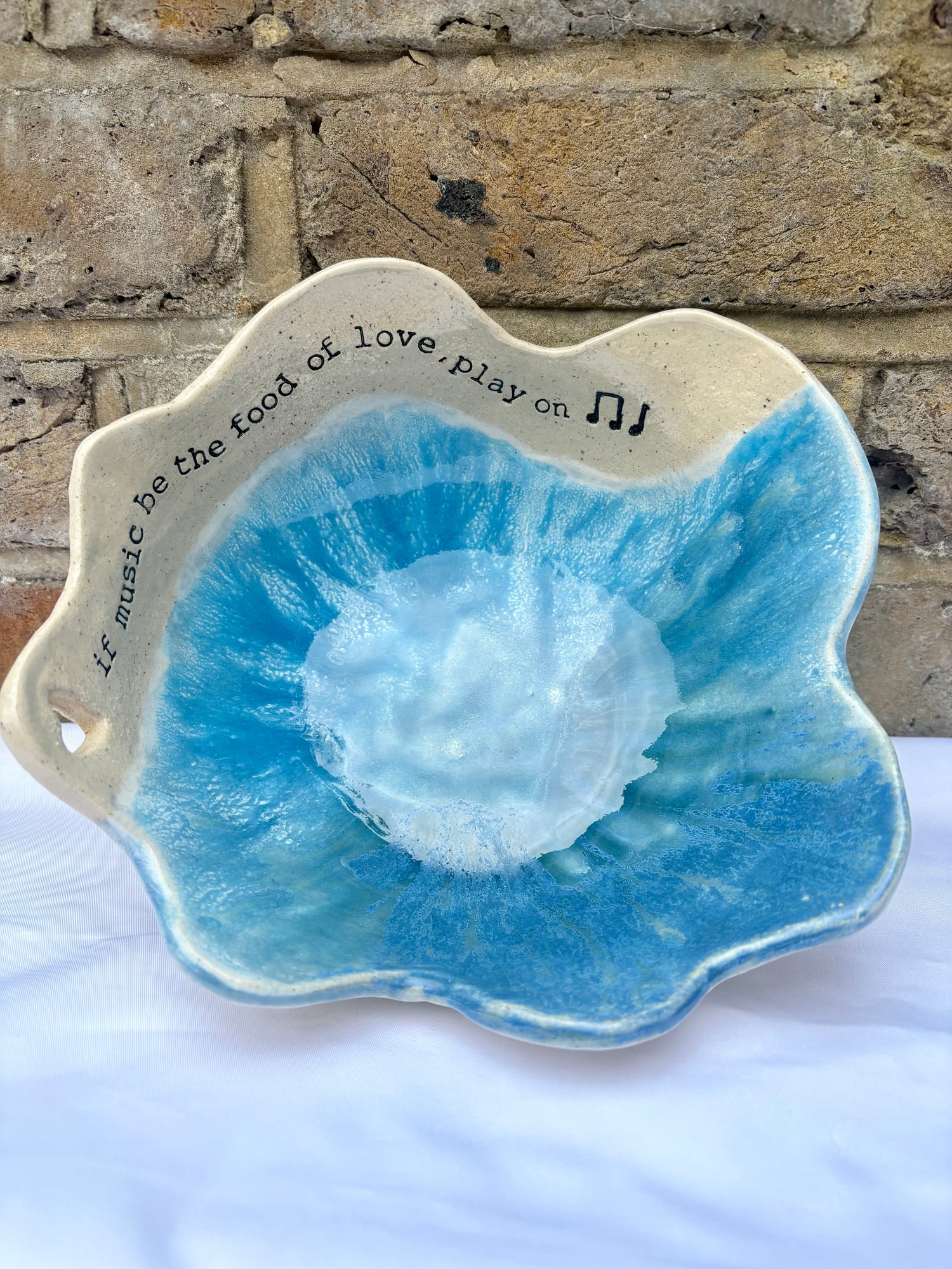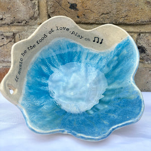 Handmade bowl with Shakespeare's famous quote from Twelfth Night: "If music be the food of love, play on" and imprinted with Shakespeare on the base