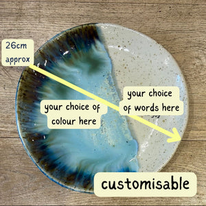 *Please let me know the size, clay, glaze colour and words and words placement you would like on your plate when you order it or we can email directly (nea@ceramicsbynea.com)