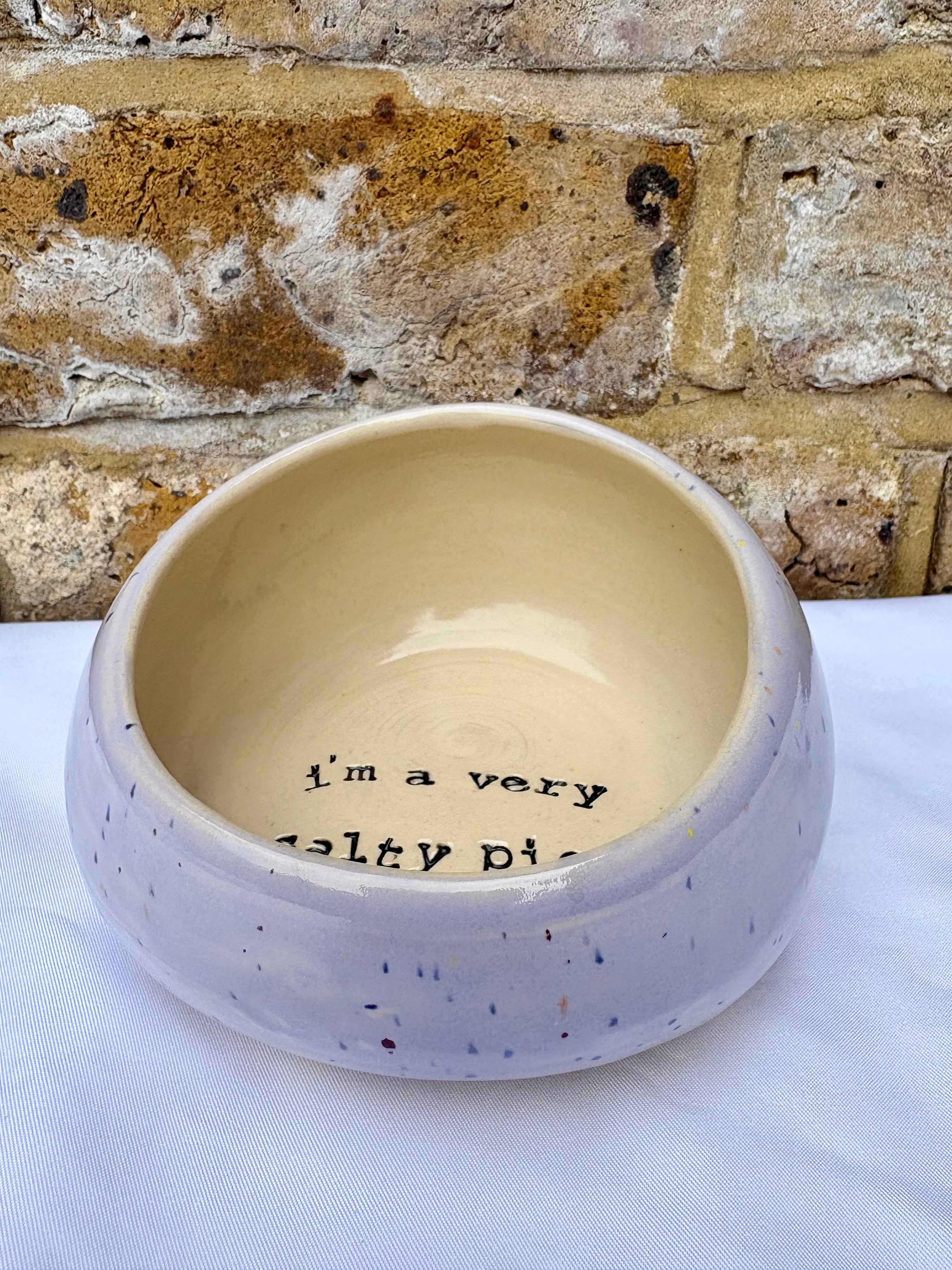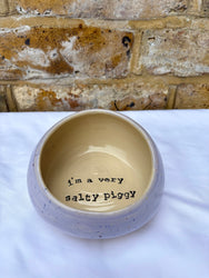 "I'm a very salty piggy" Salt Pig (wheelthrown, lilac speckle glaze)