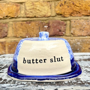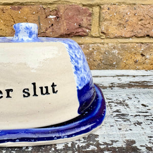 Imprinted with words “butter slut” on lid