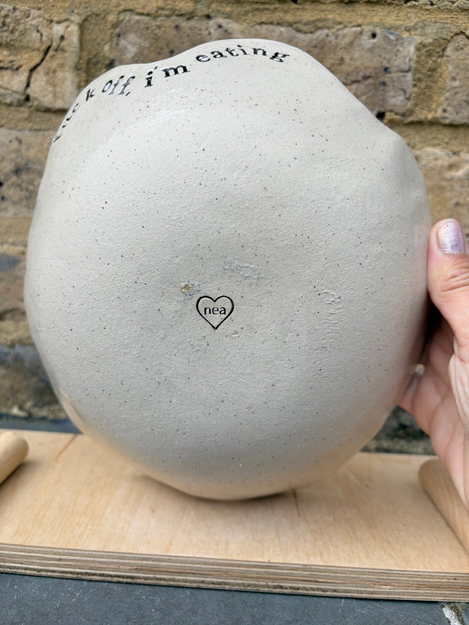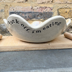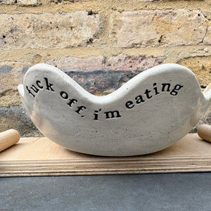 Wany edged bowl imprinted with "fuck off, i'm eating" on the outside rim