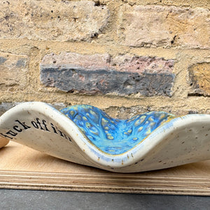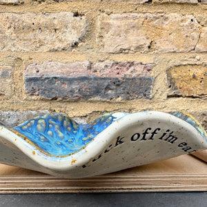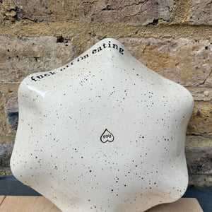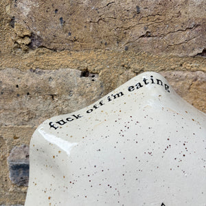 Wany edged bowl imprinted with "fuck off, i'm eating" on the outside rim