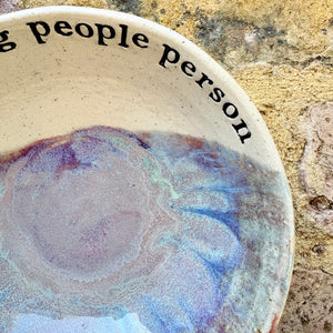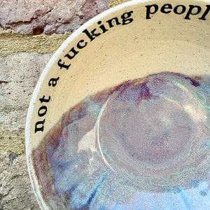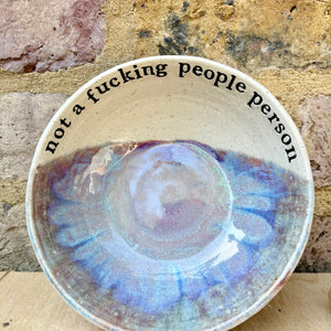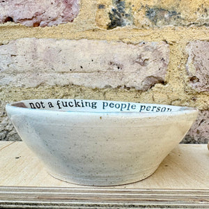 Wheelthrown bowl imprinted with "not a fucking people person" on rim