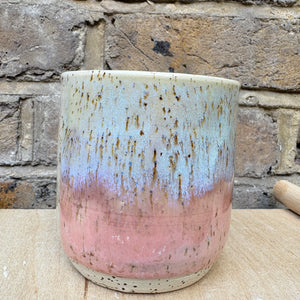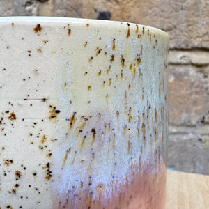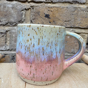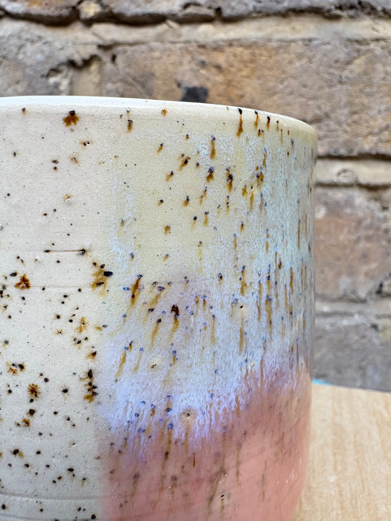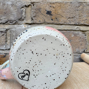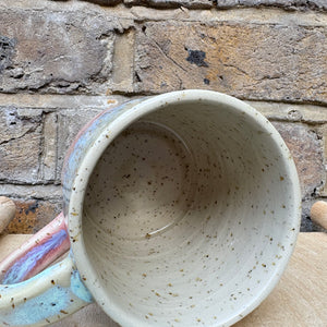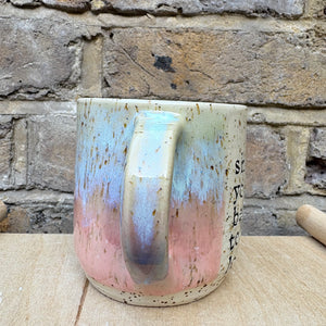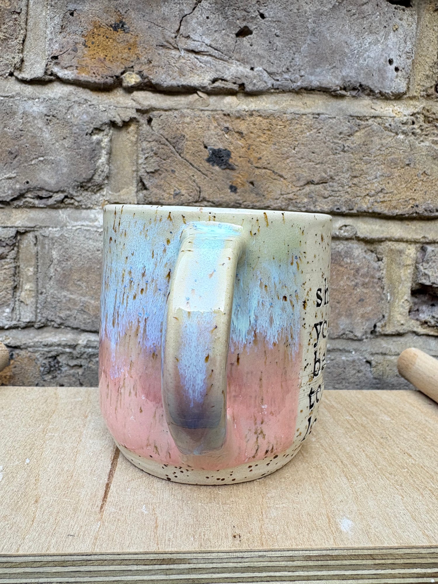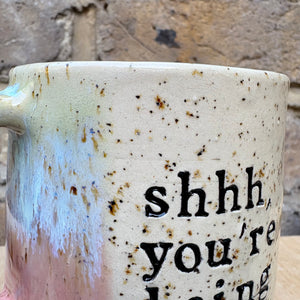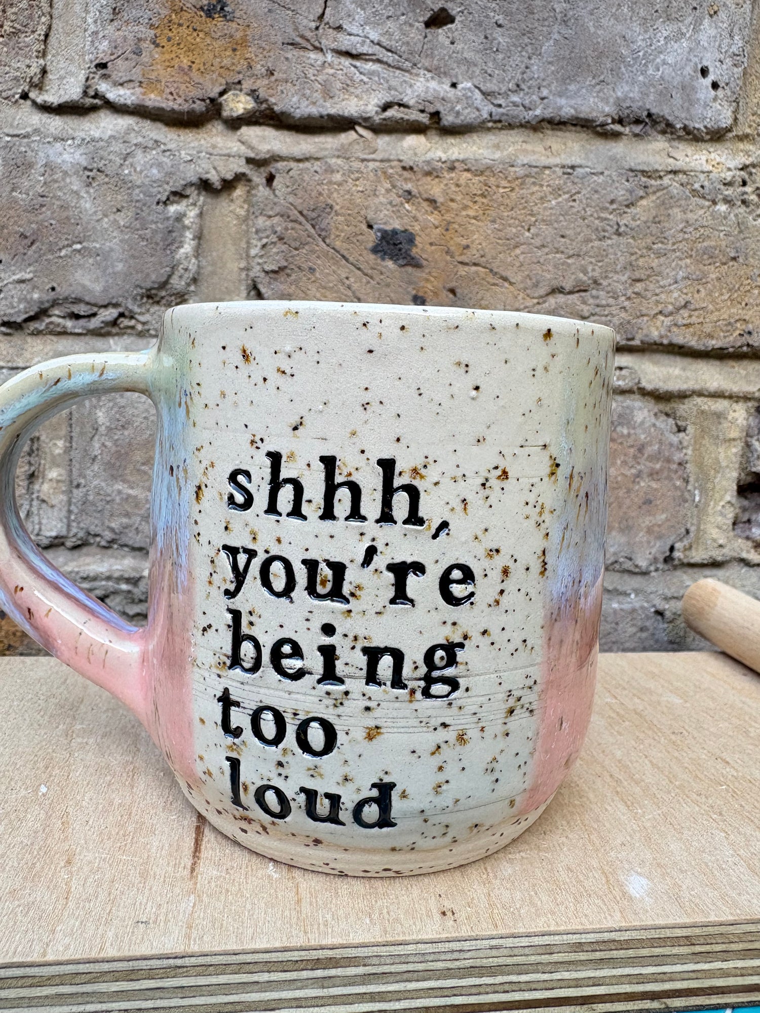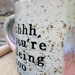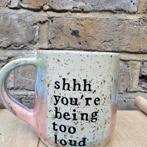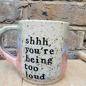 Wheelthrown mug imprinted with "shhh...you're being too loud" on side