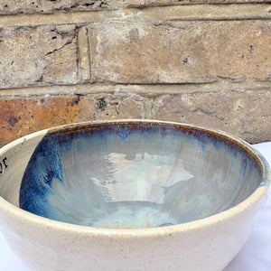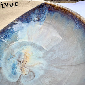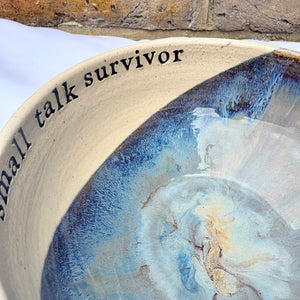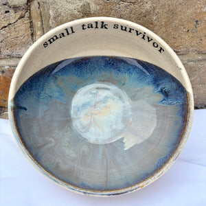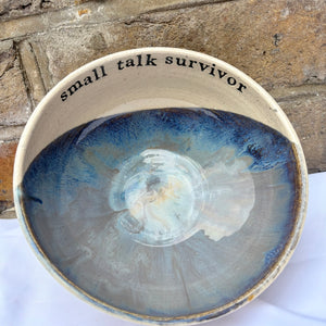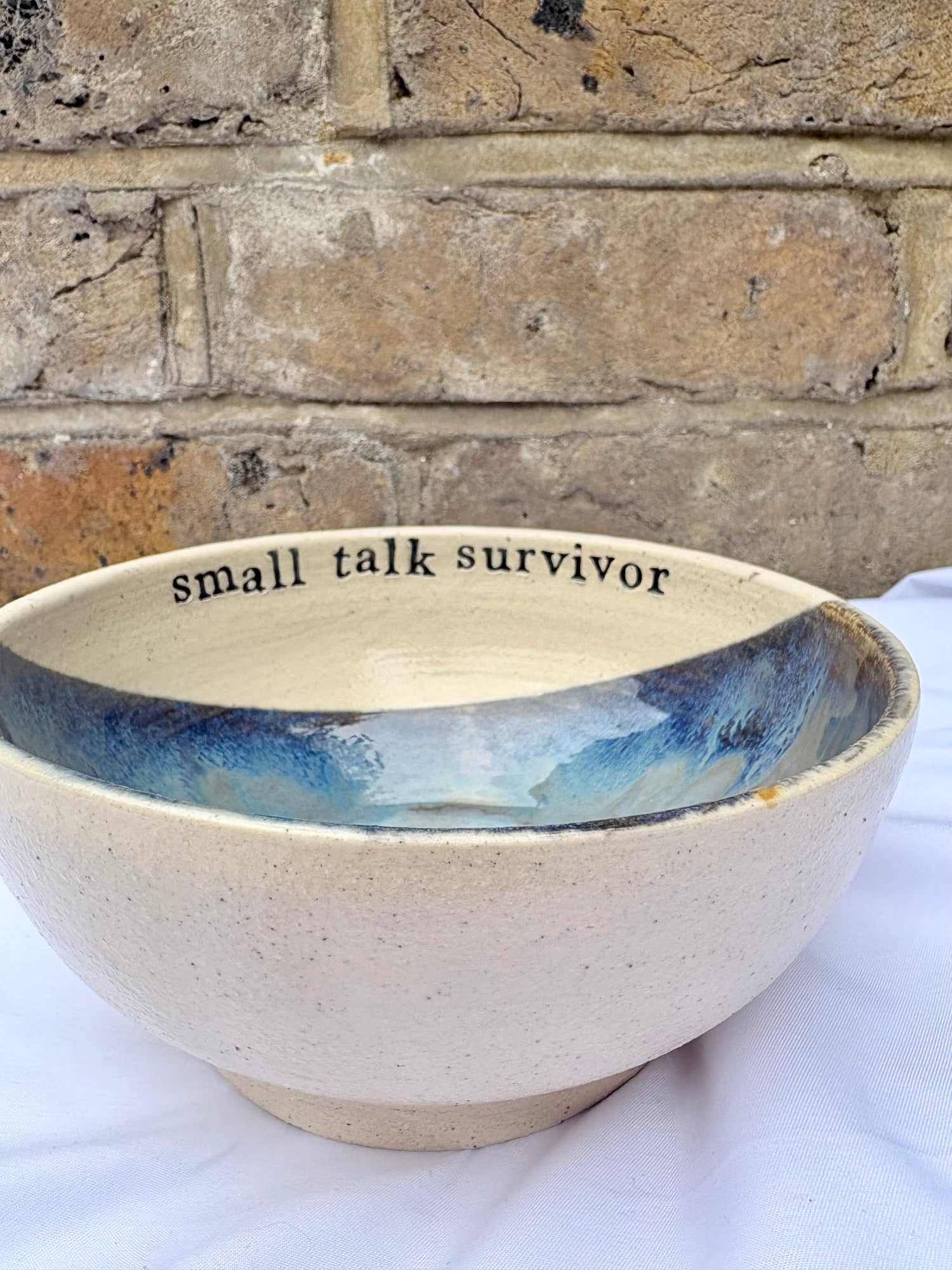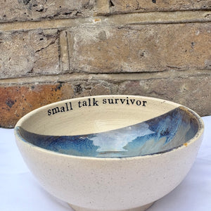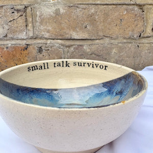 Wheelthrown bowl imprinted with "small talk survivor" on inside rim