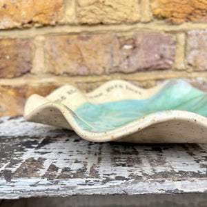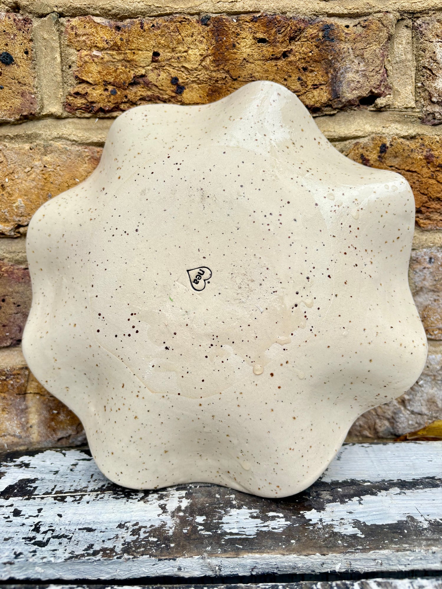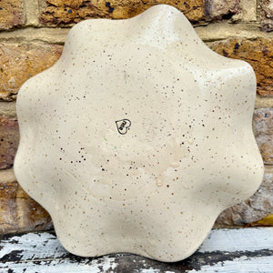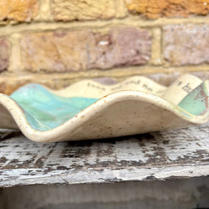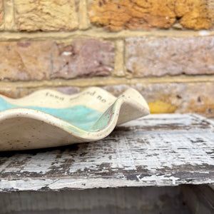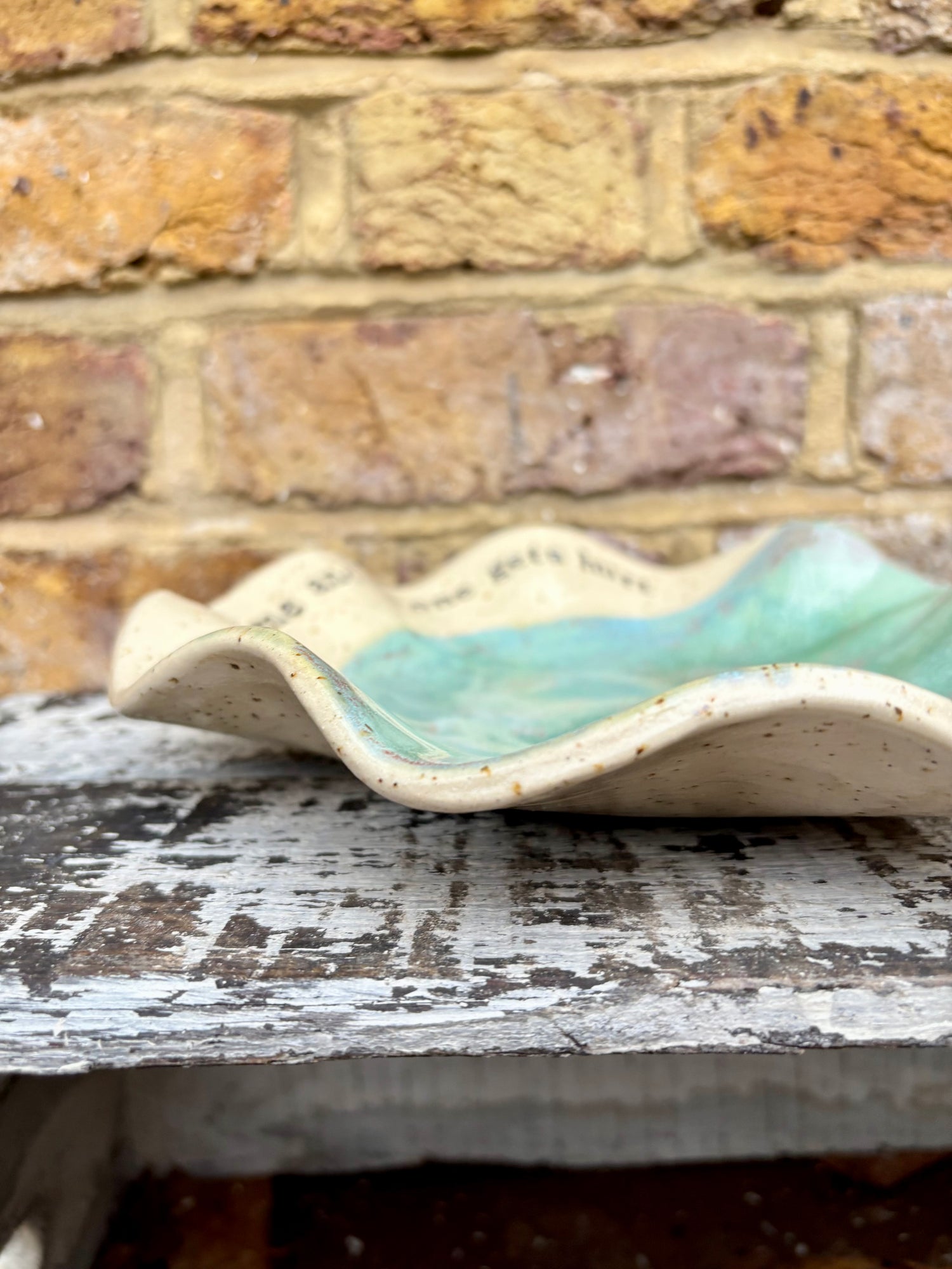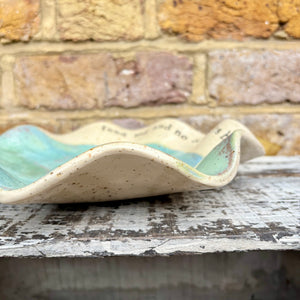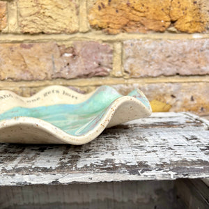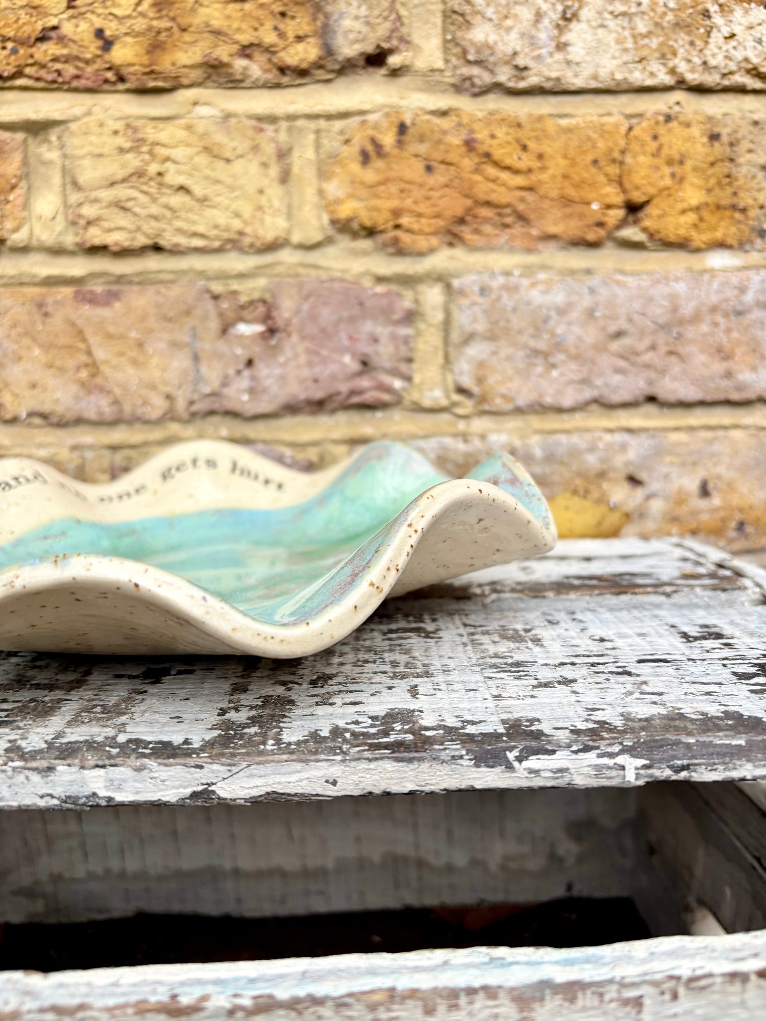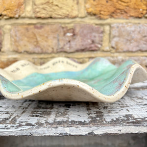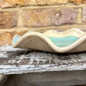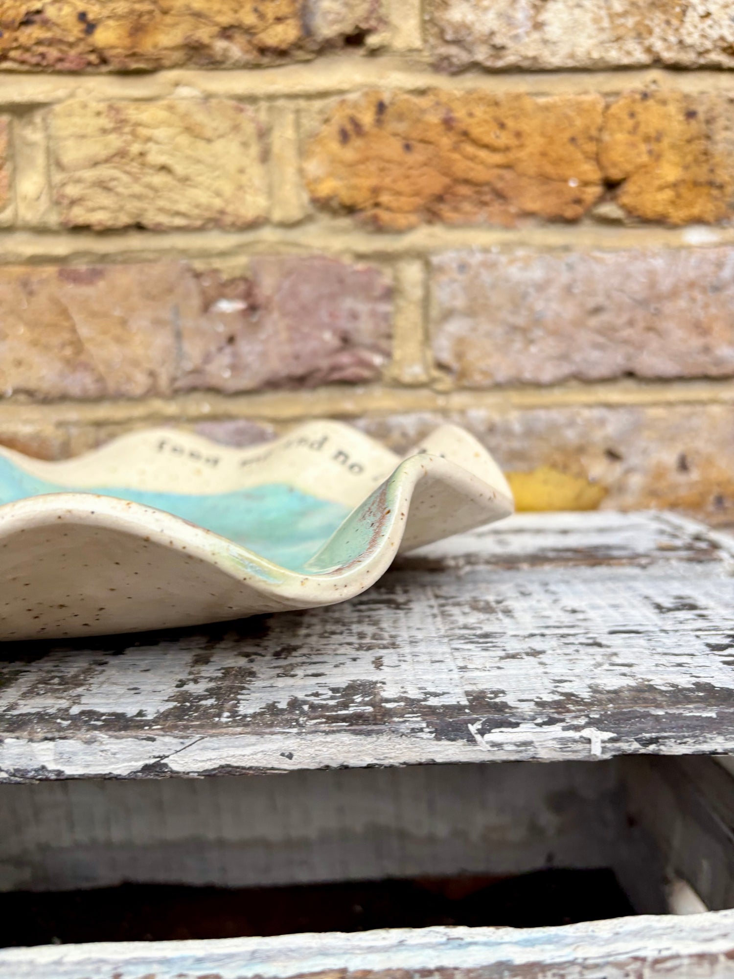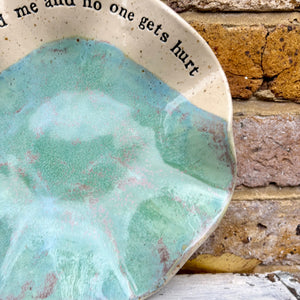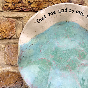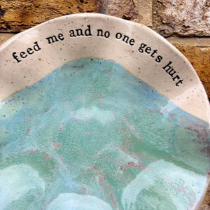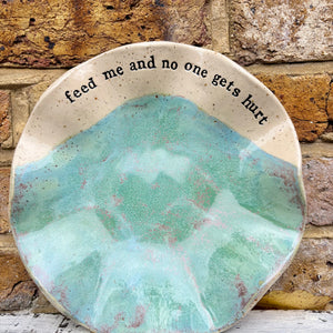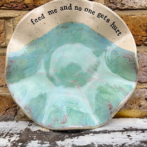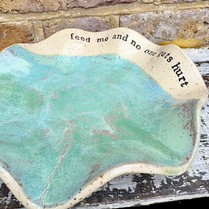 Handmade with irregular wavy edges, this "feed me and no one gets hurt" serving dish is going to make you laugh every time you see it.