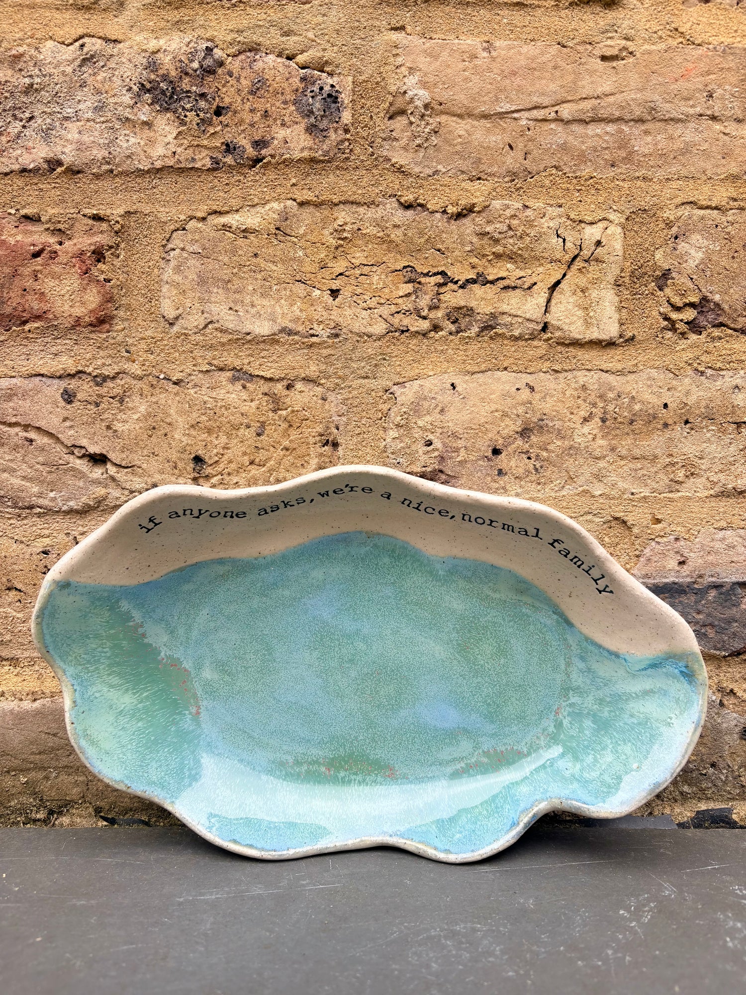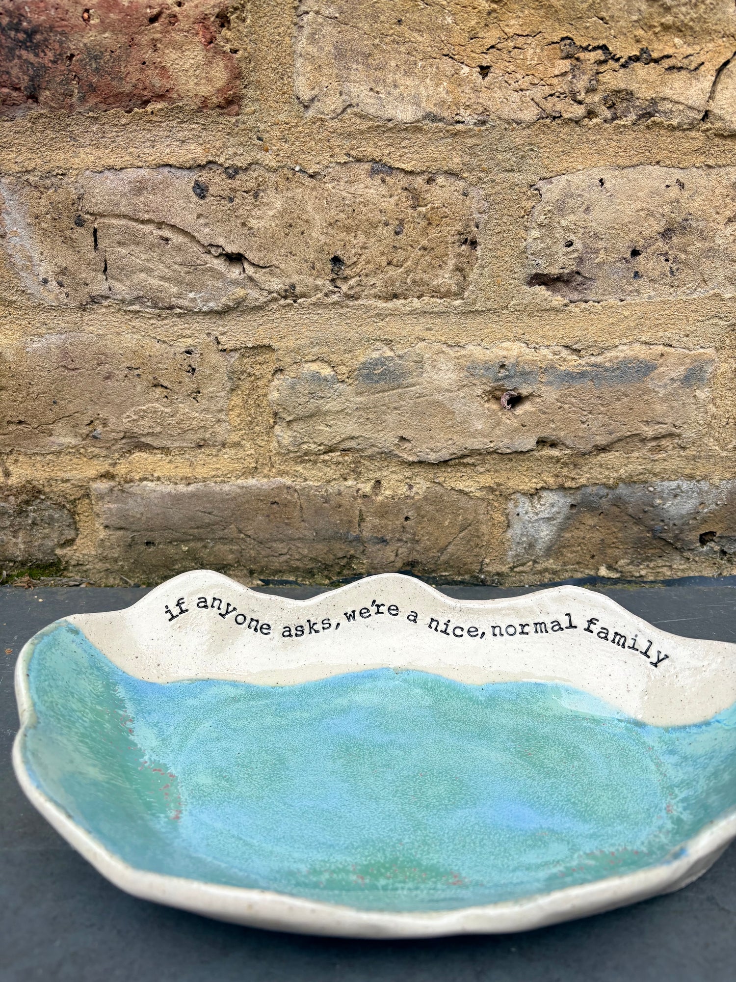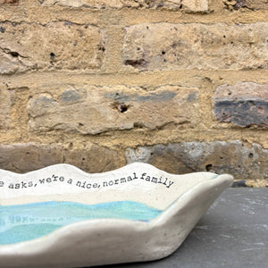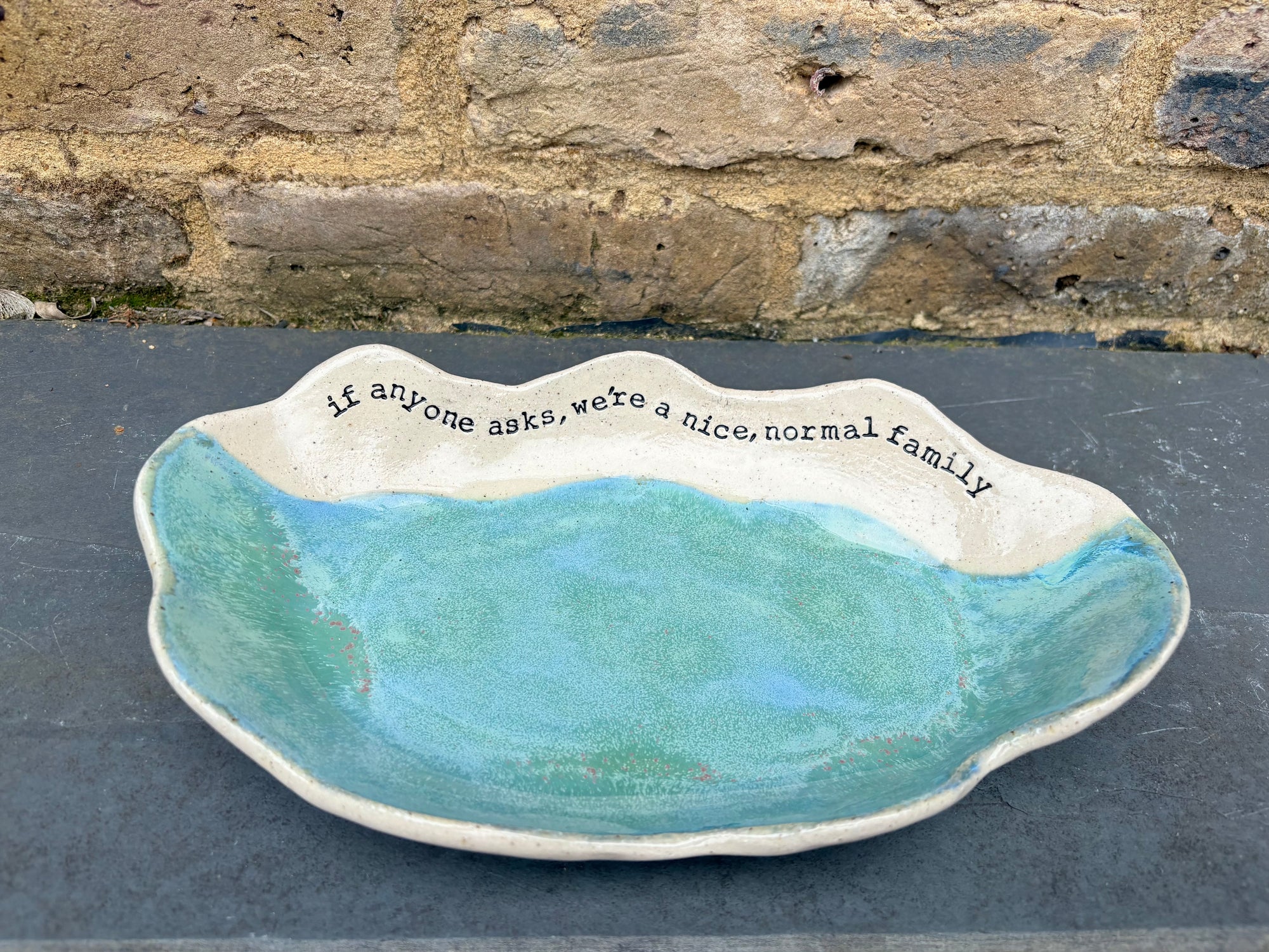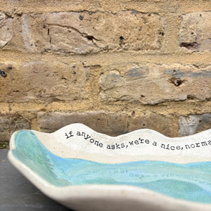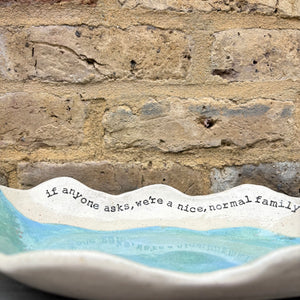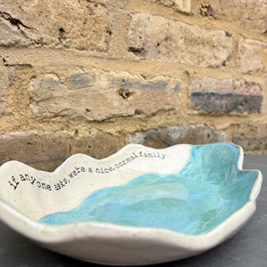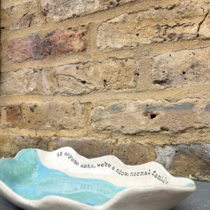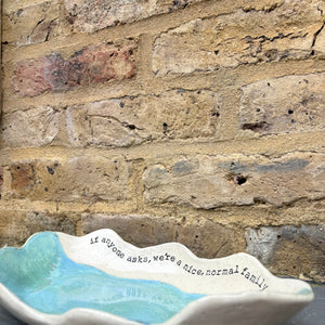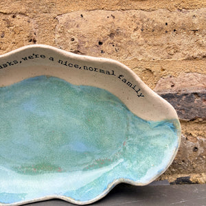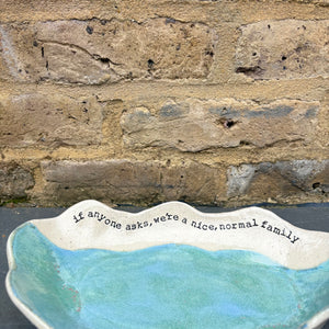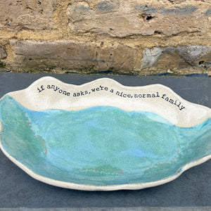 Wavy edged and glazed in Peacock Green and imprinted with funny message on rim "if anyone asks, we're a nice normal family"