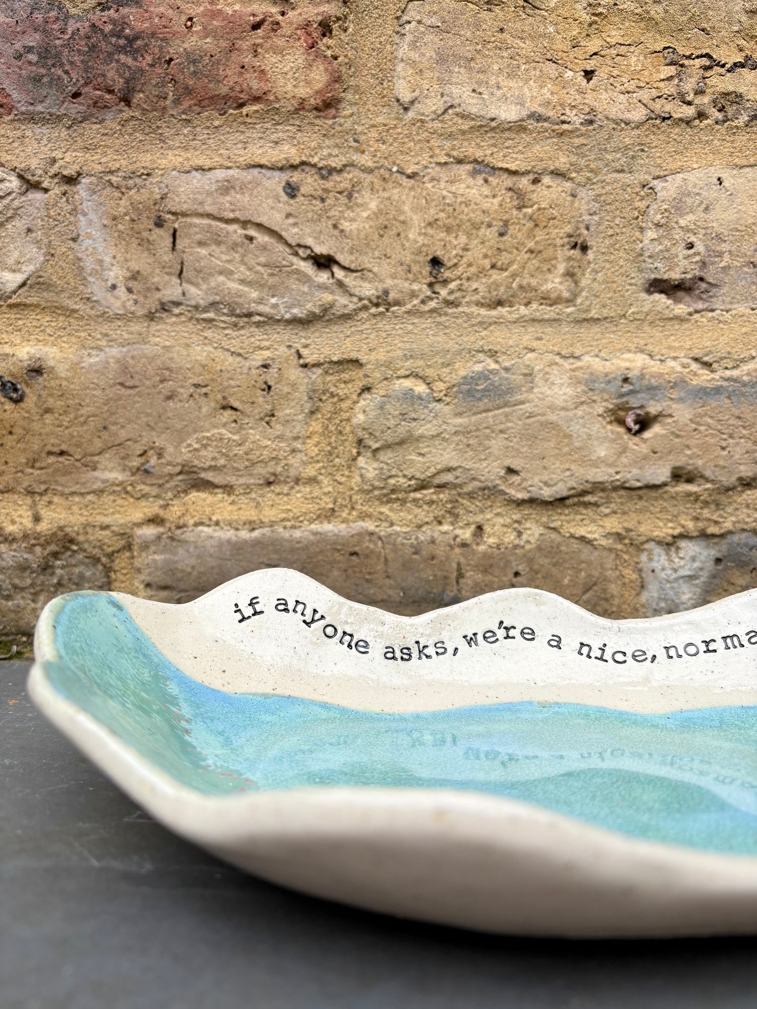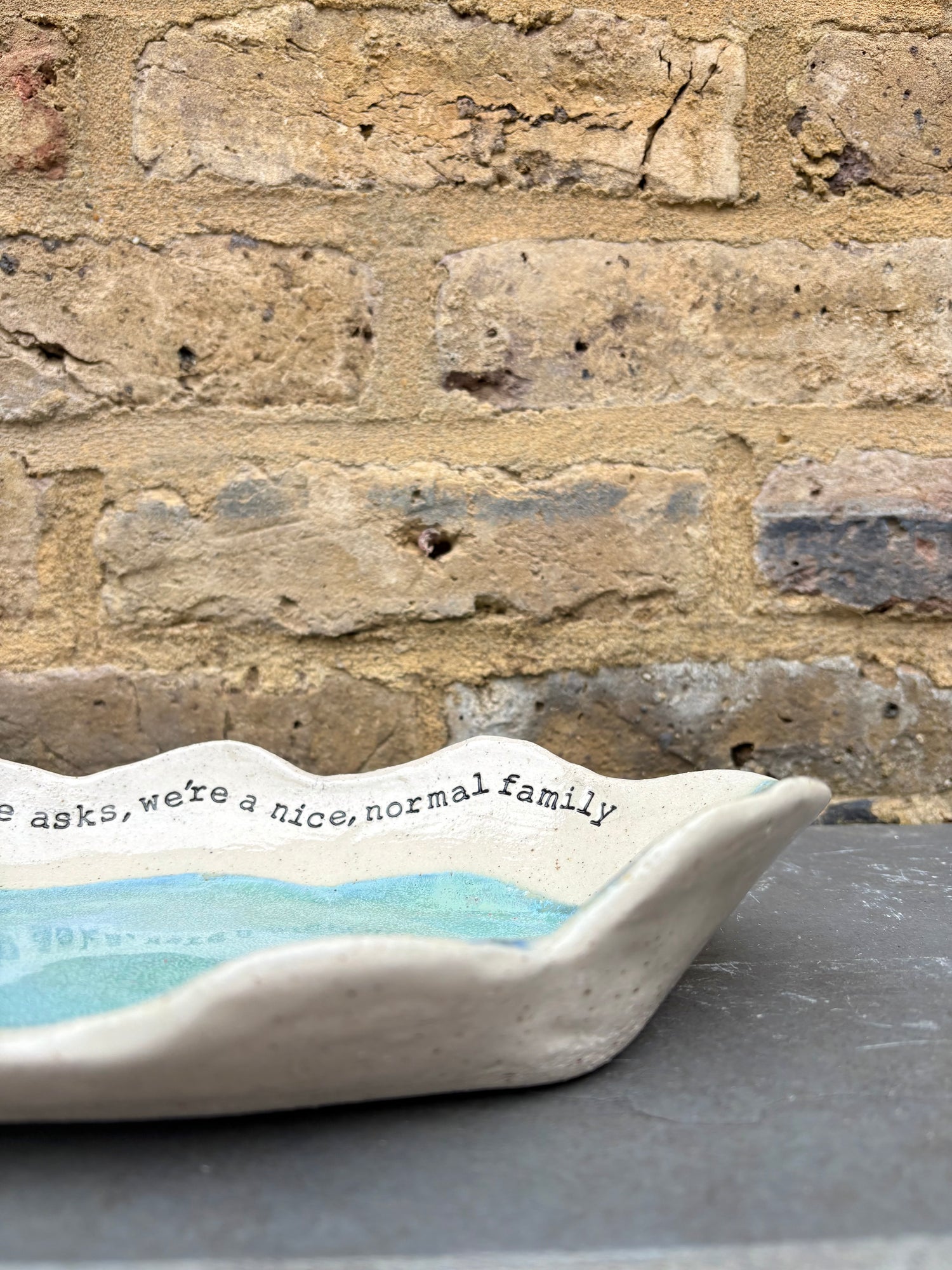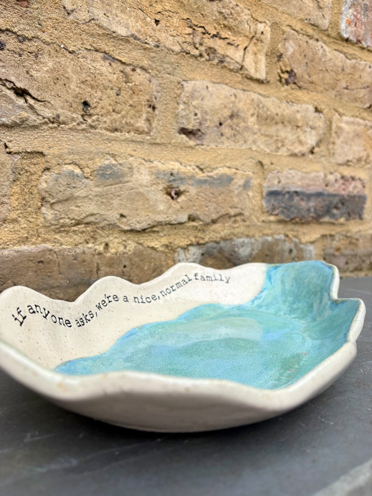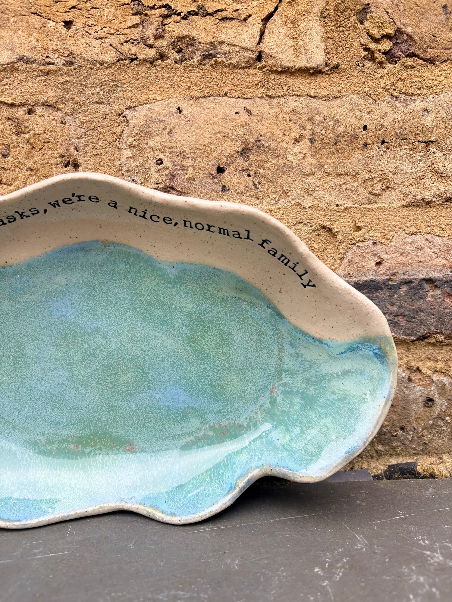 Wavy edged and glazed in Peacock Green and imprinted with funny message on rim "if anyone asks, we're a nice normal family"