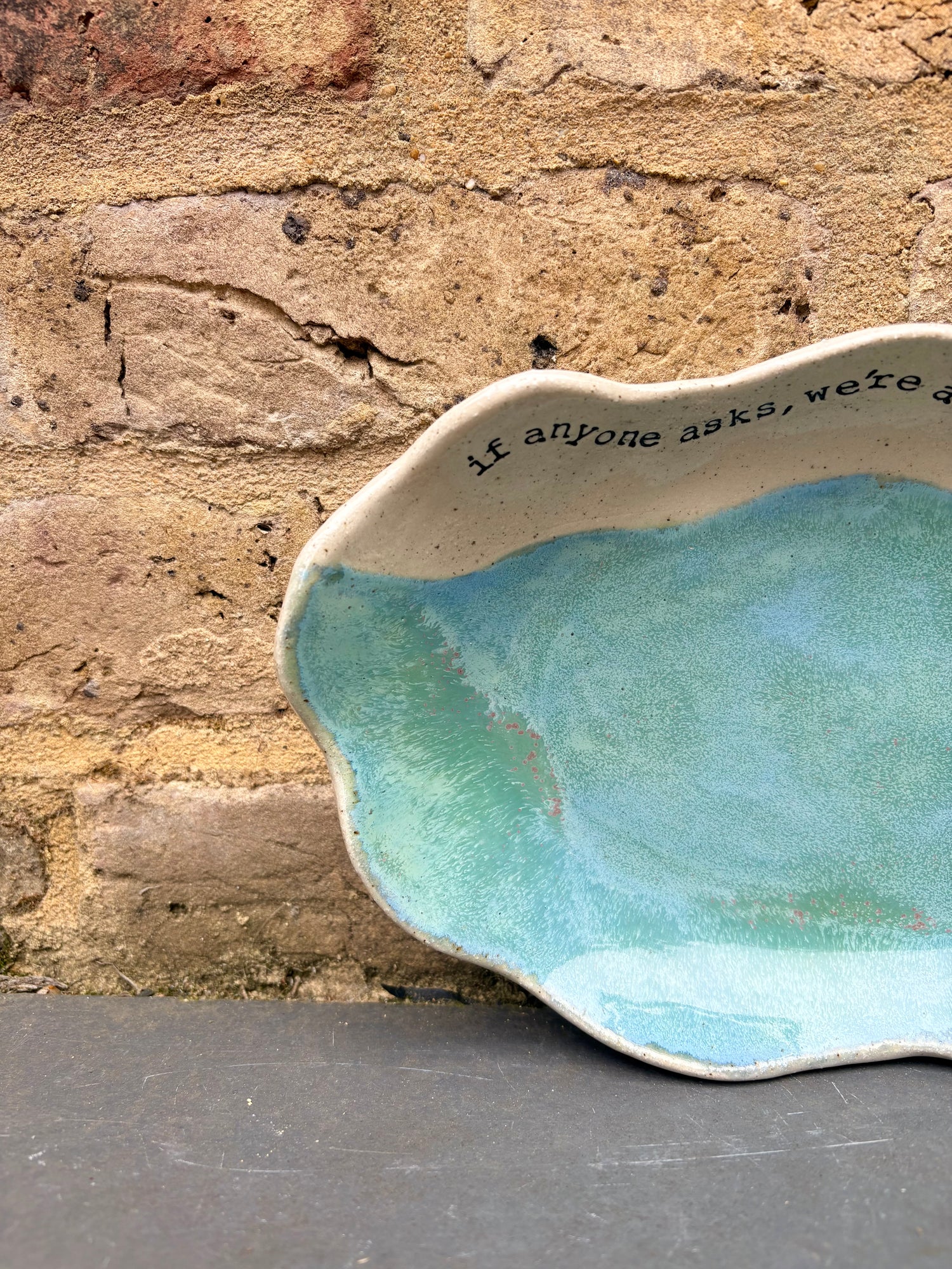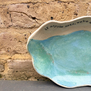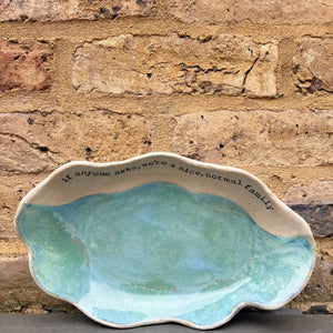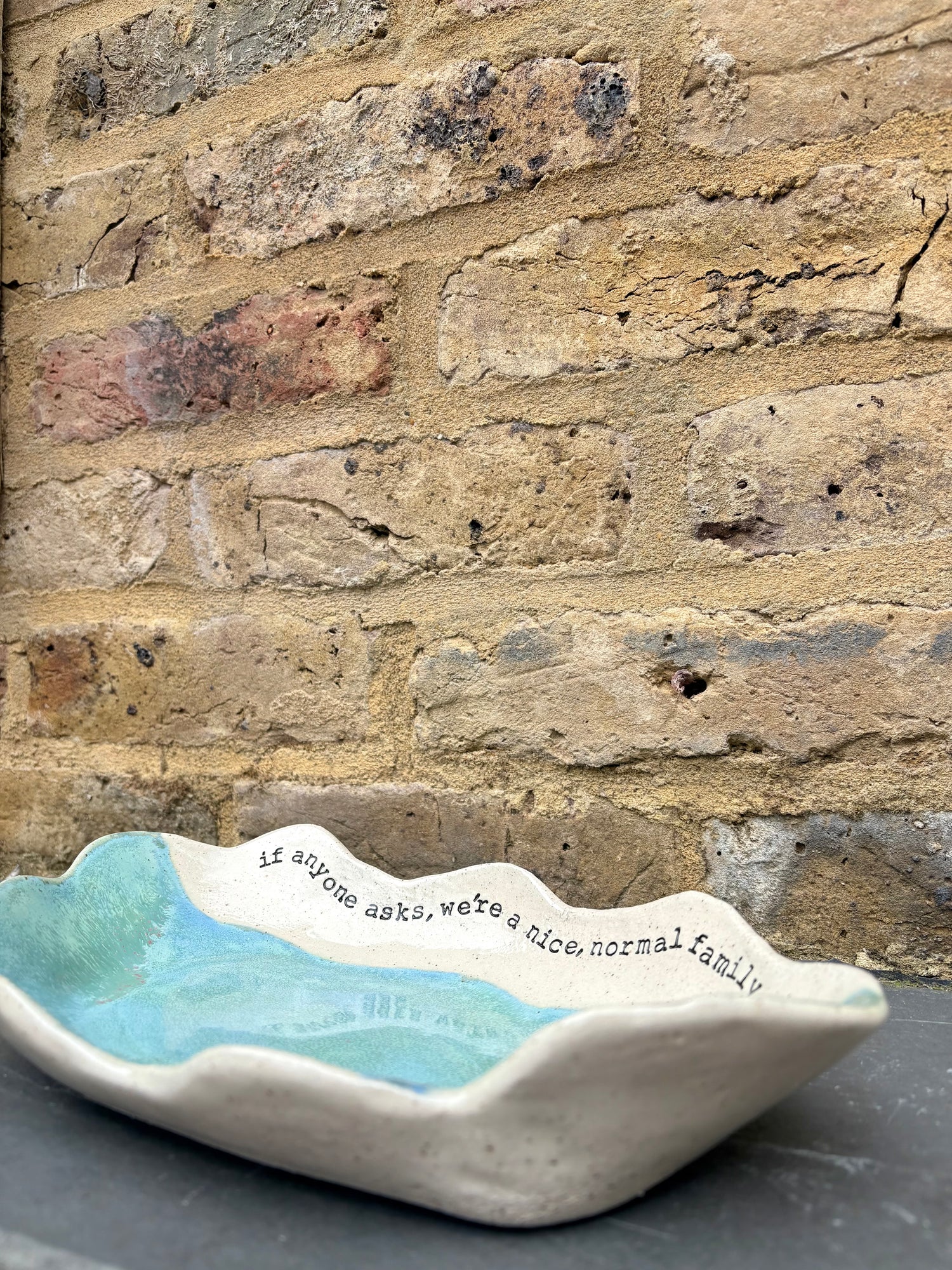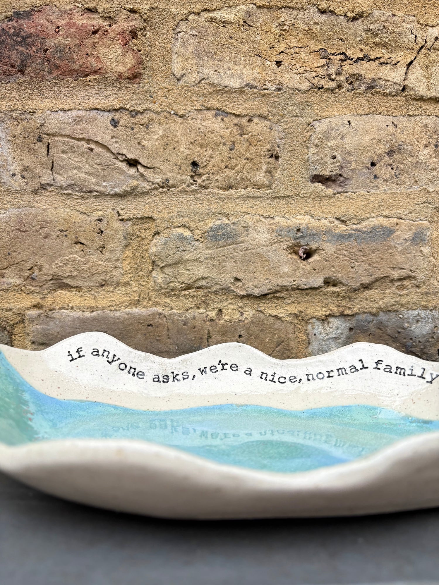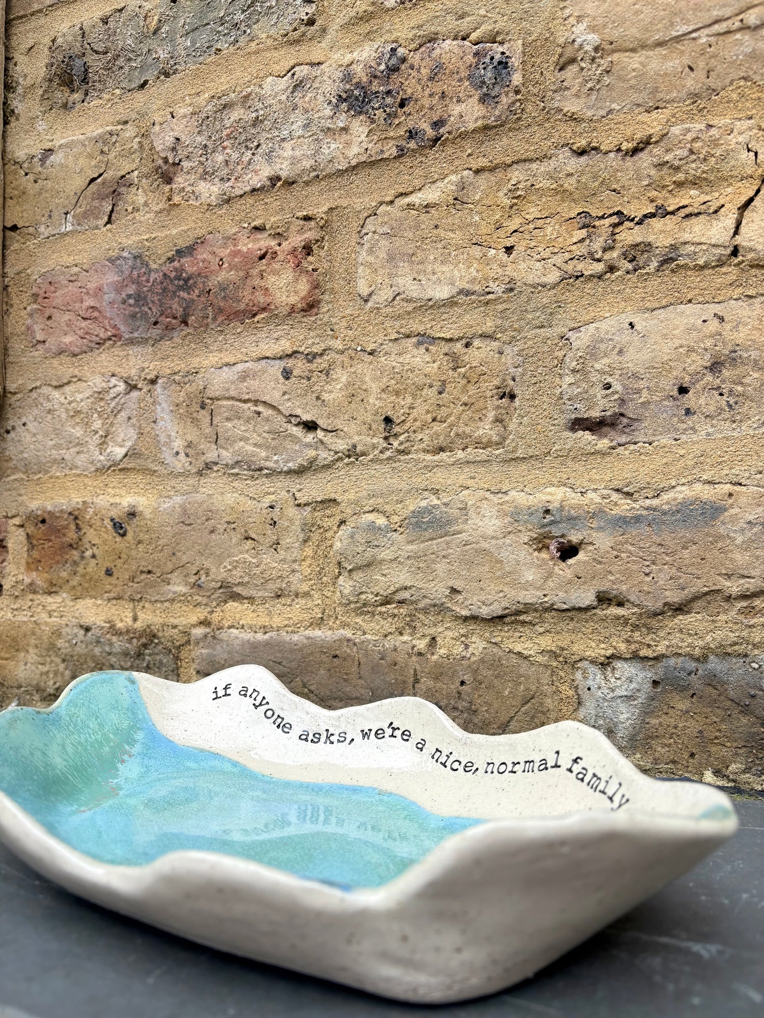 Wavy edged and glazed in Peacock Green and imprinted with funny message on rim "if anyone asks, we're a nice normal family"