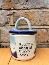 Handmade lidded pots with imprinted funny messages