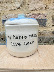 "my happy pills live here" lidded pot (oyster blue)