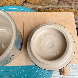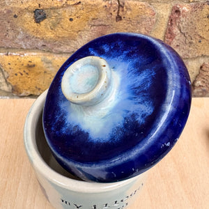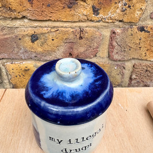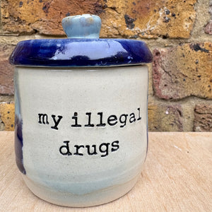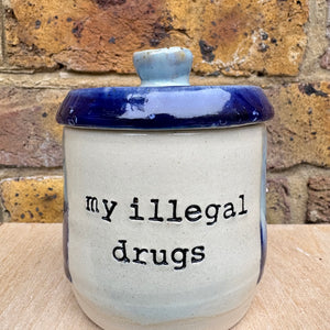 Gorgeous handmade lidded pot with knob imprinted with words "my illegal drugs"