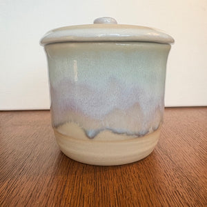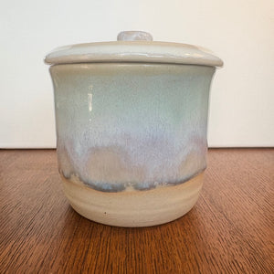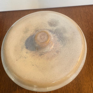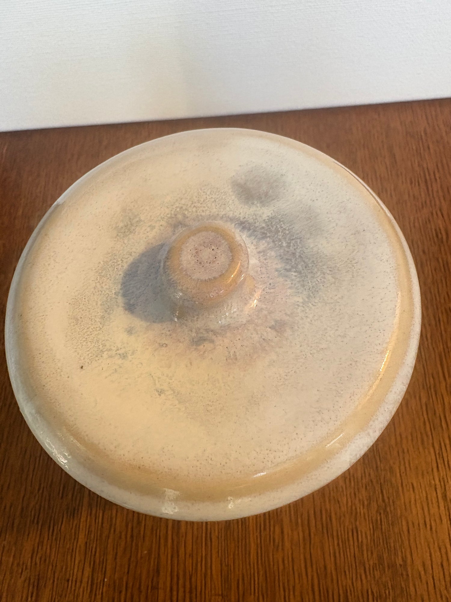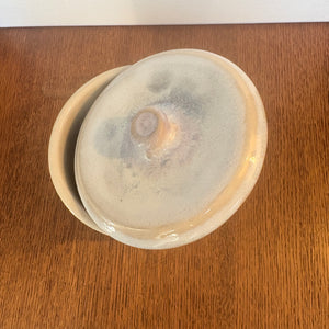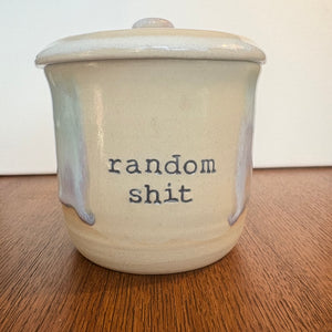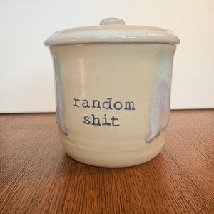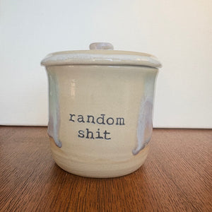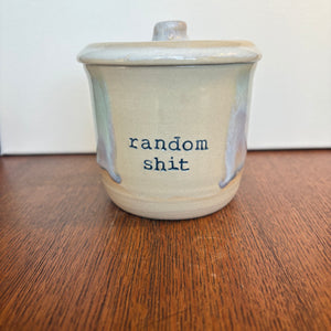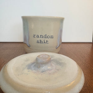 Gorgeous handmade lidded pot with knob imprinted with words "random shit"