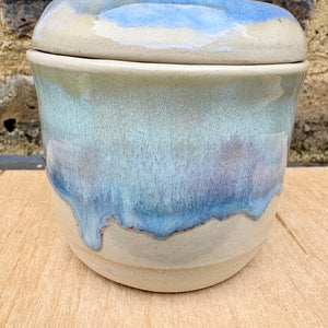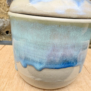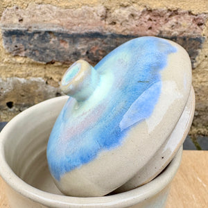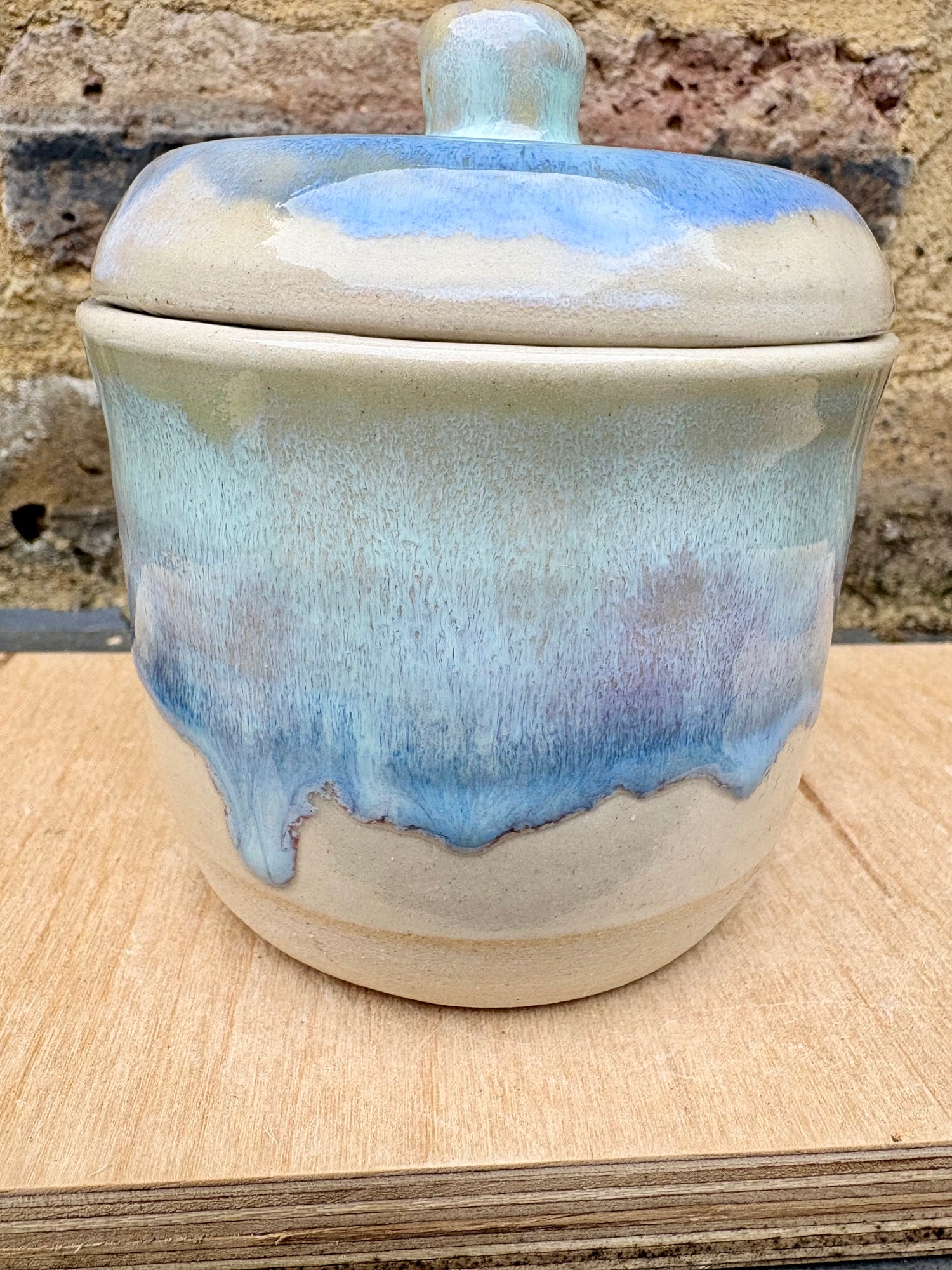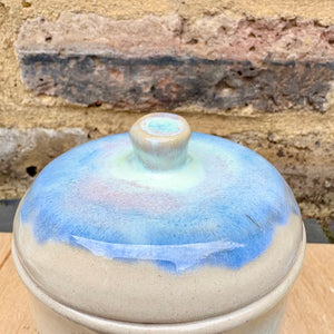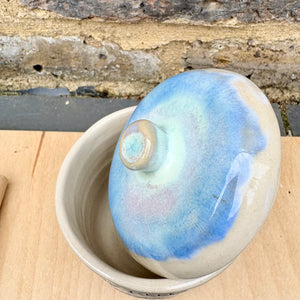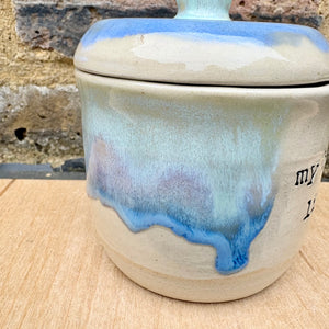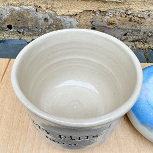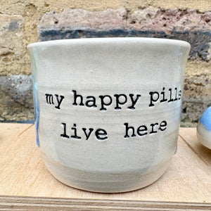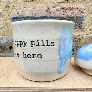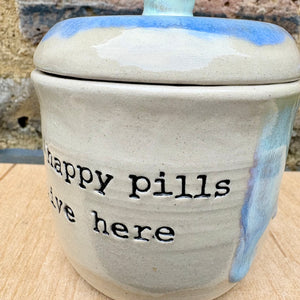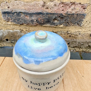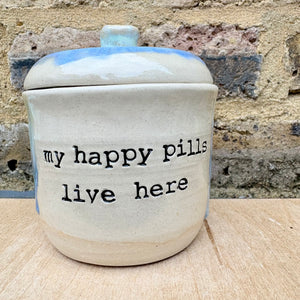 Gorgeous handmade lidded pot with knob imprinted with words "my happy pills live here"