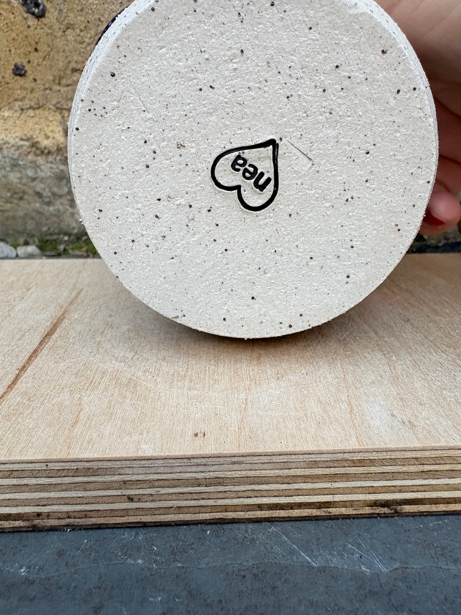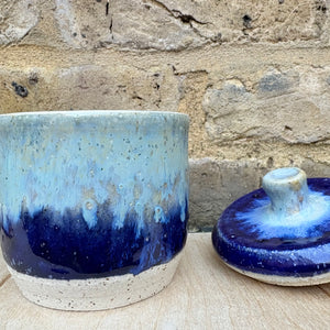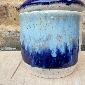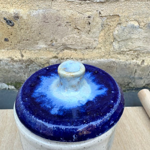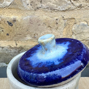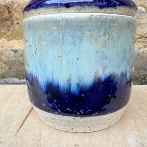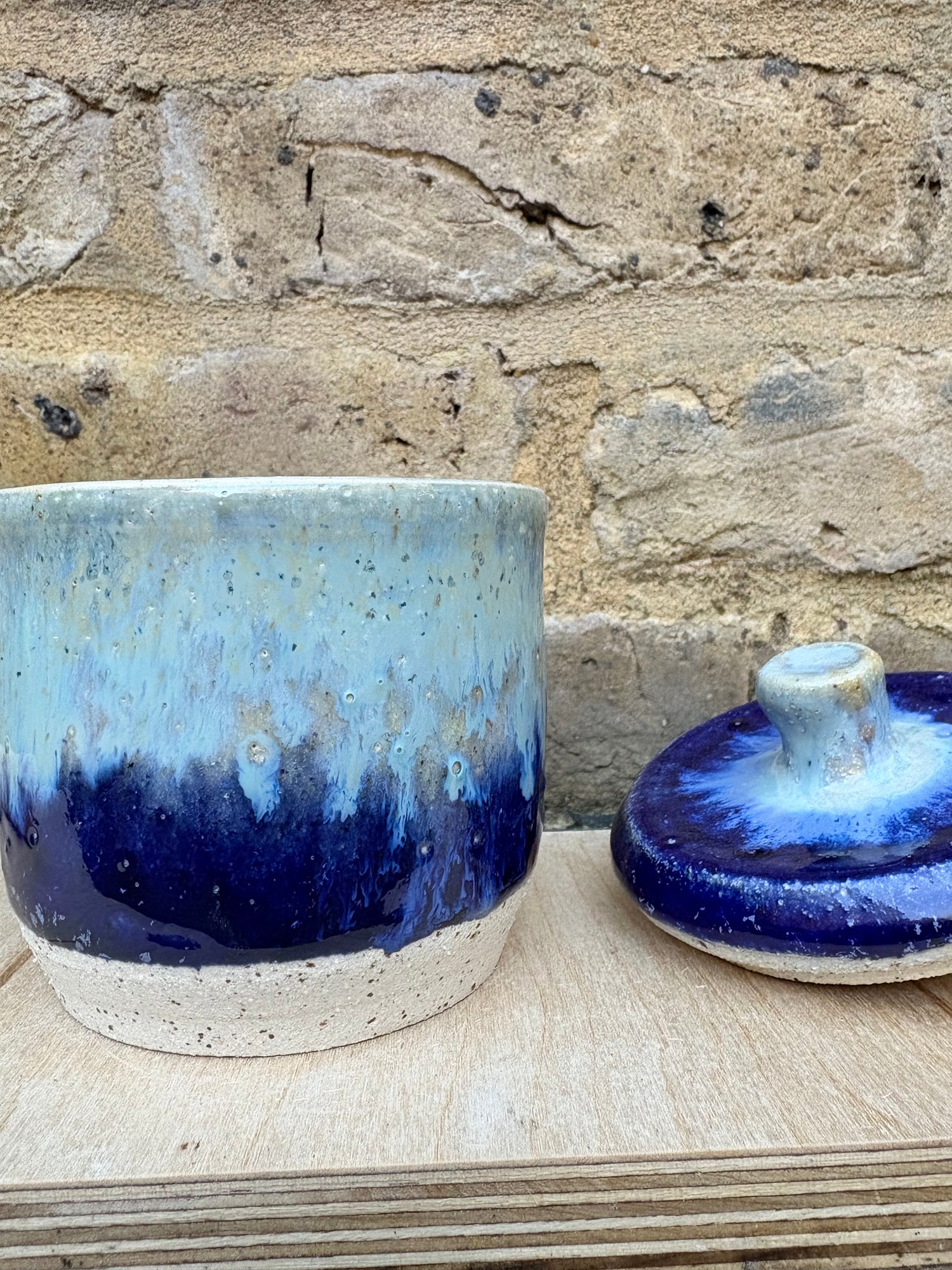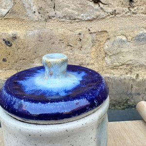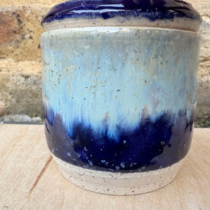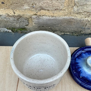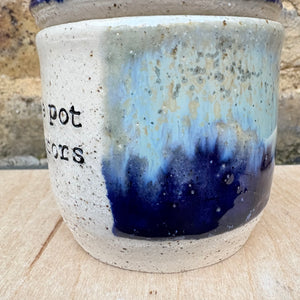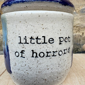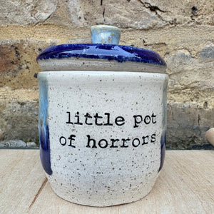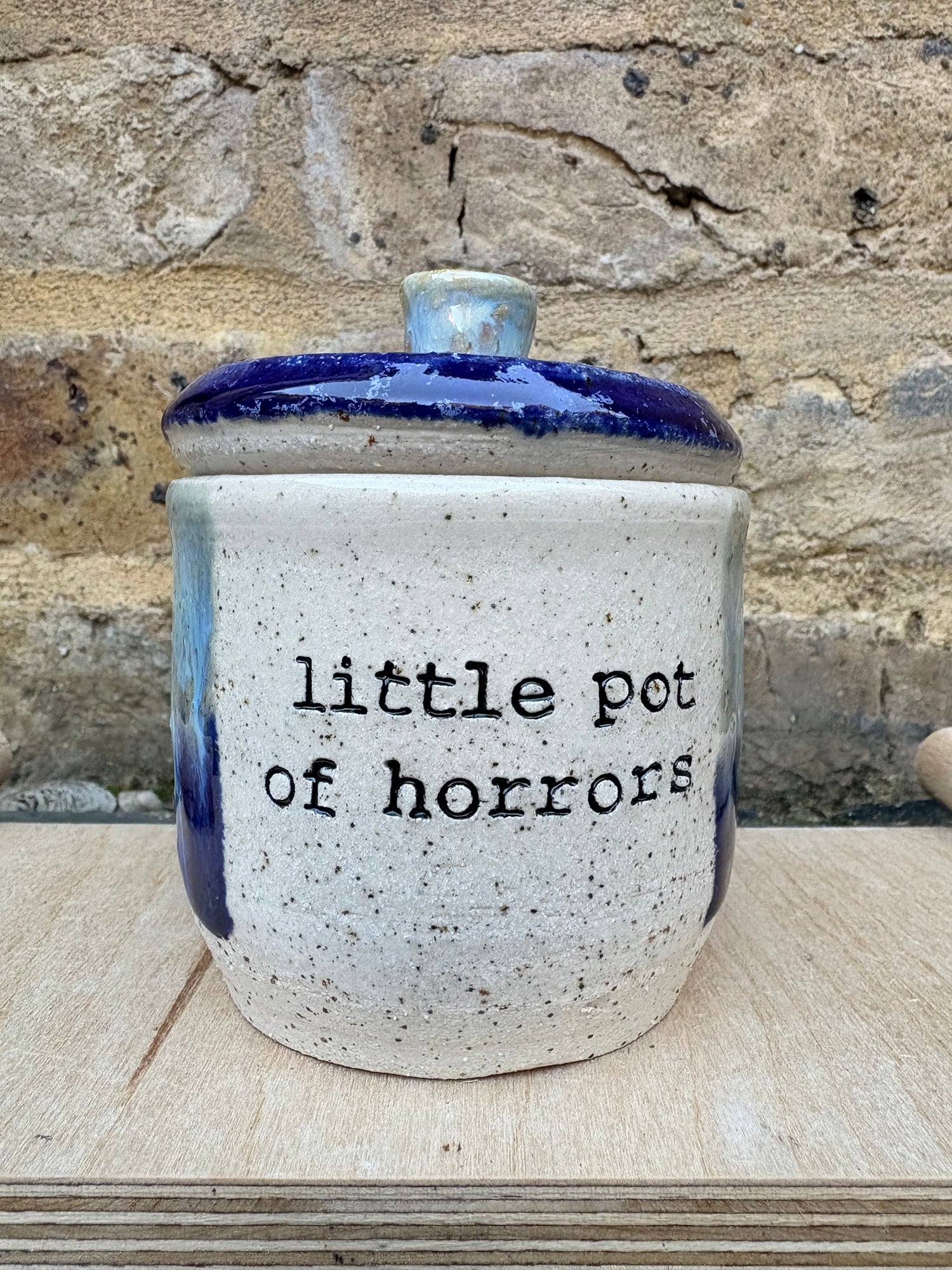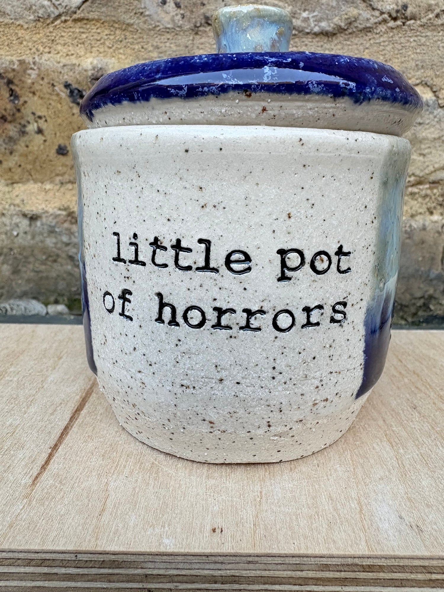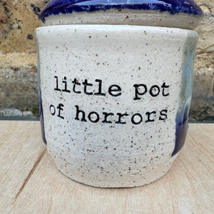 Gorgeous handmade lidded pot with knob imprinted with words “little pot of horrors"