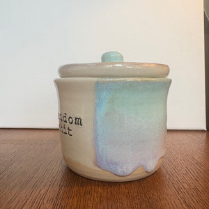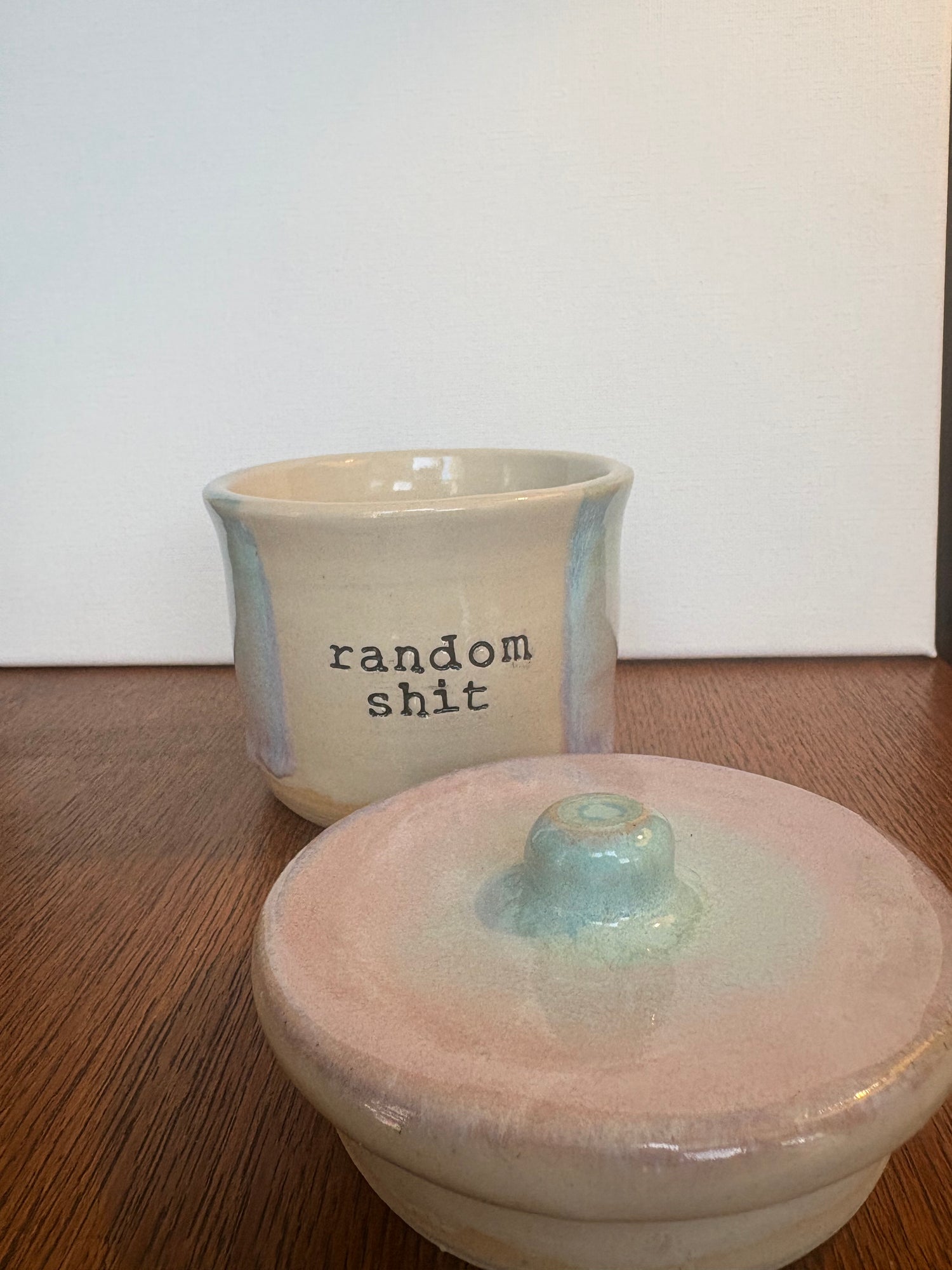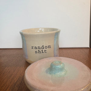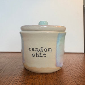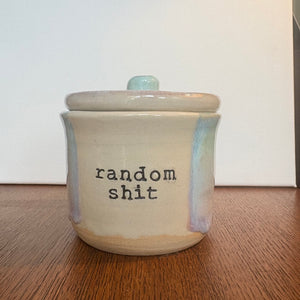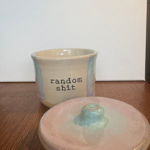 Gorgeous handmade lidded pot with knob imprinted with words "random shit"