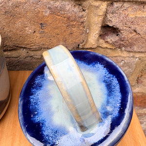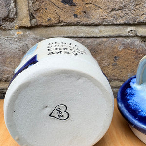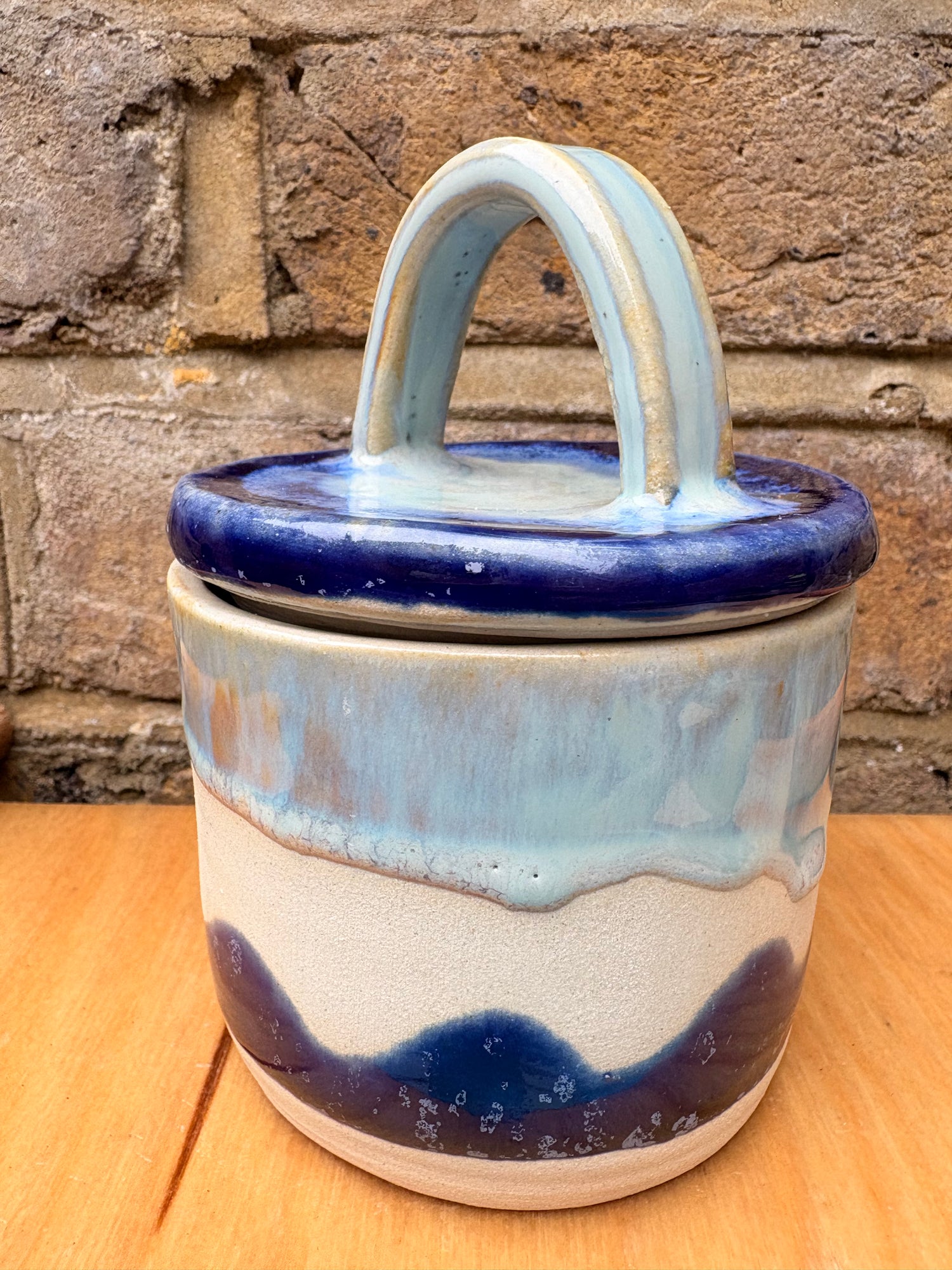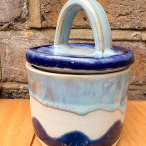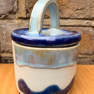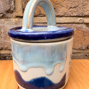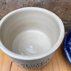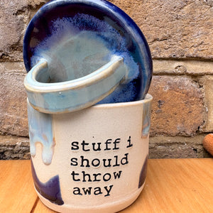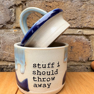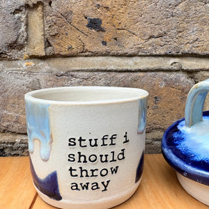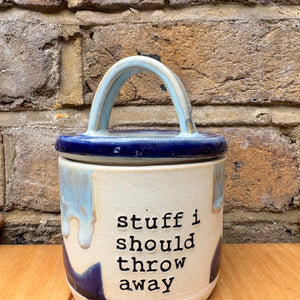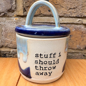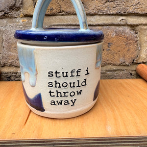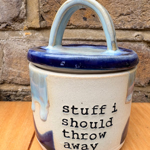 Gorgeous handmade lidded pot with handle imprinted with words “stuff i should throw away"