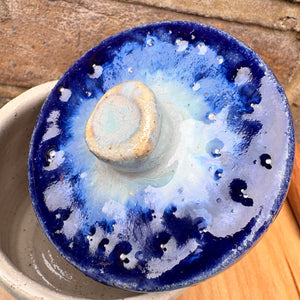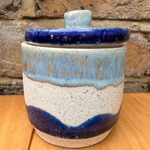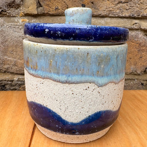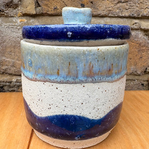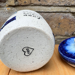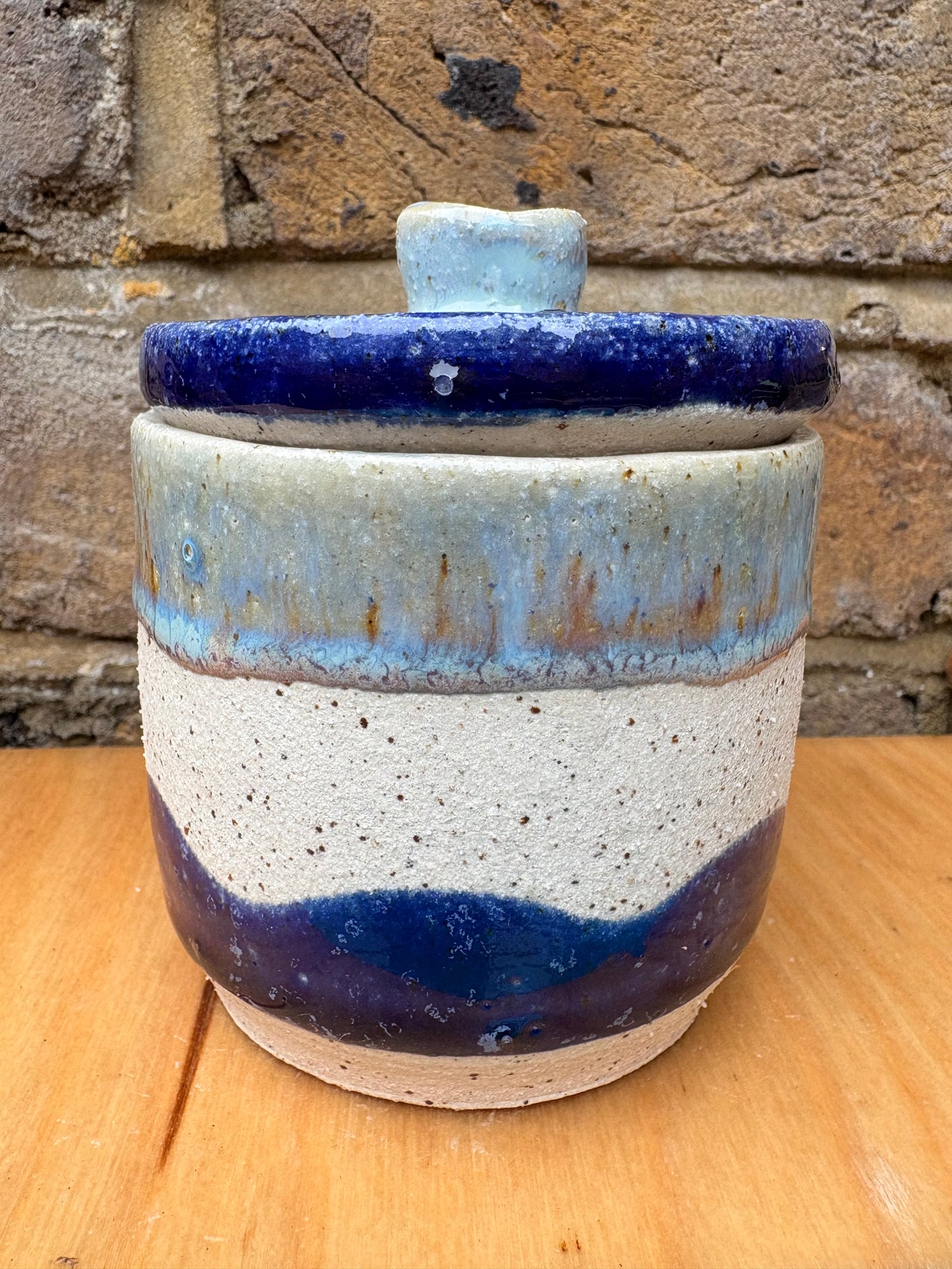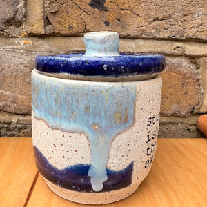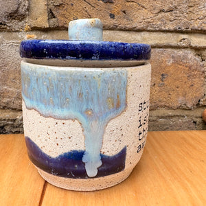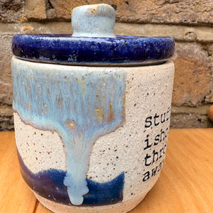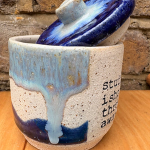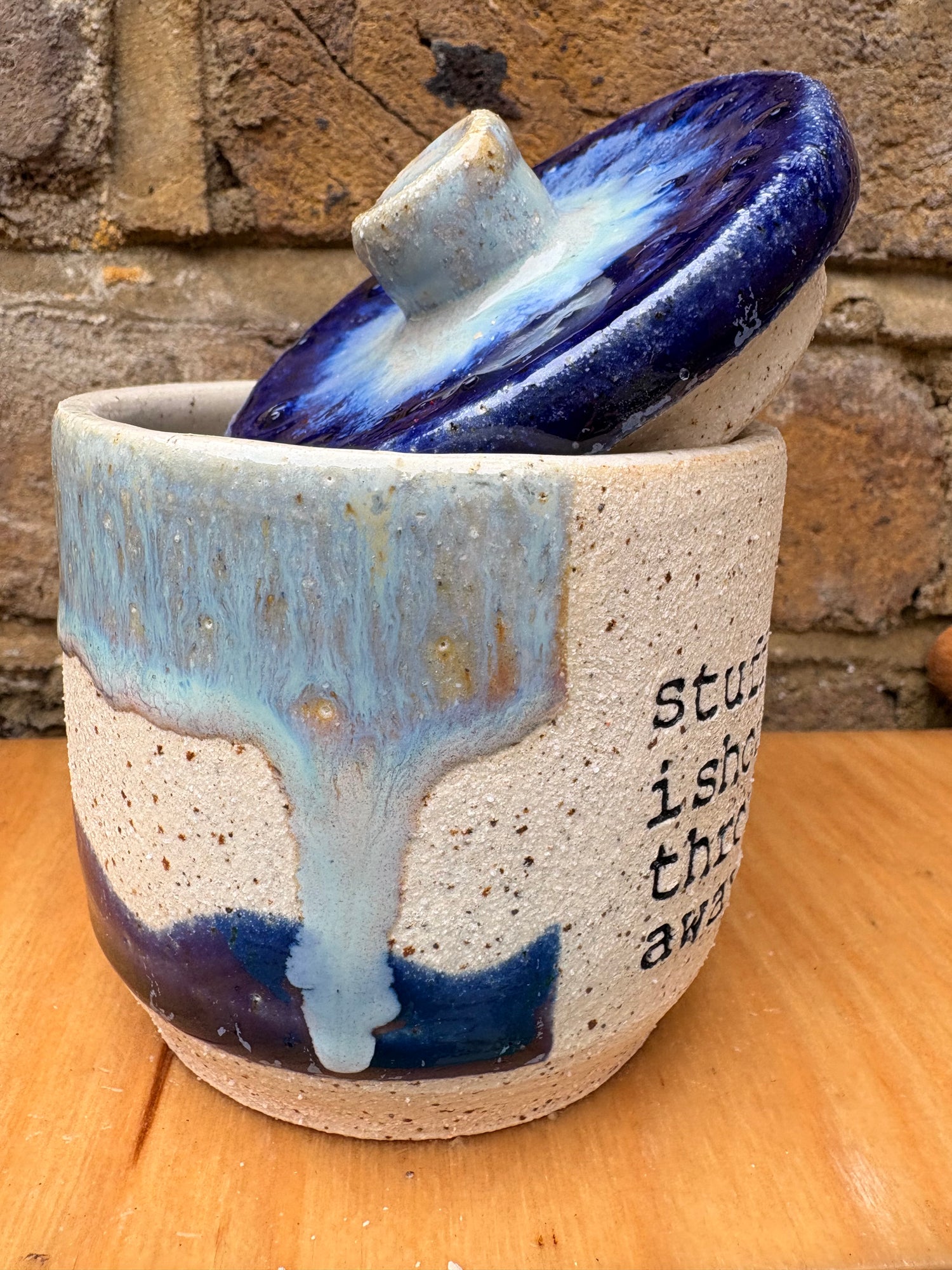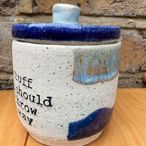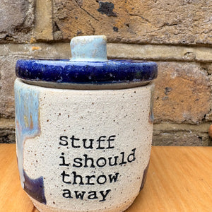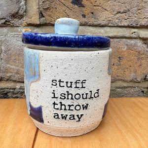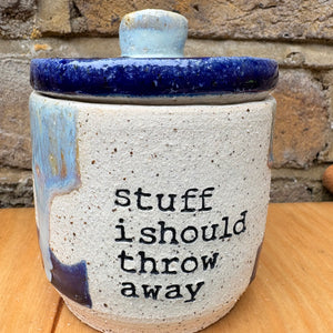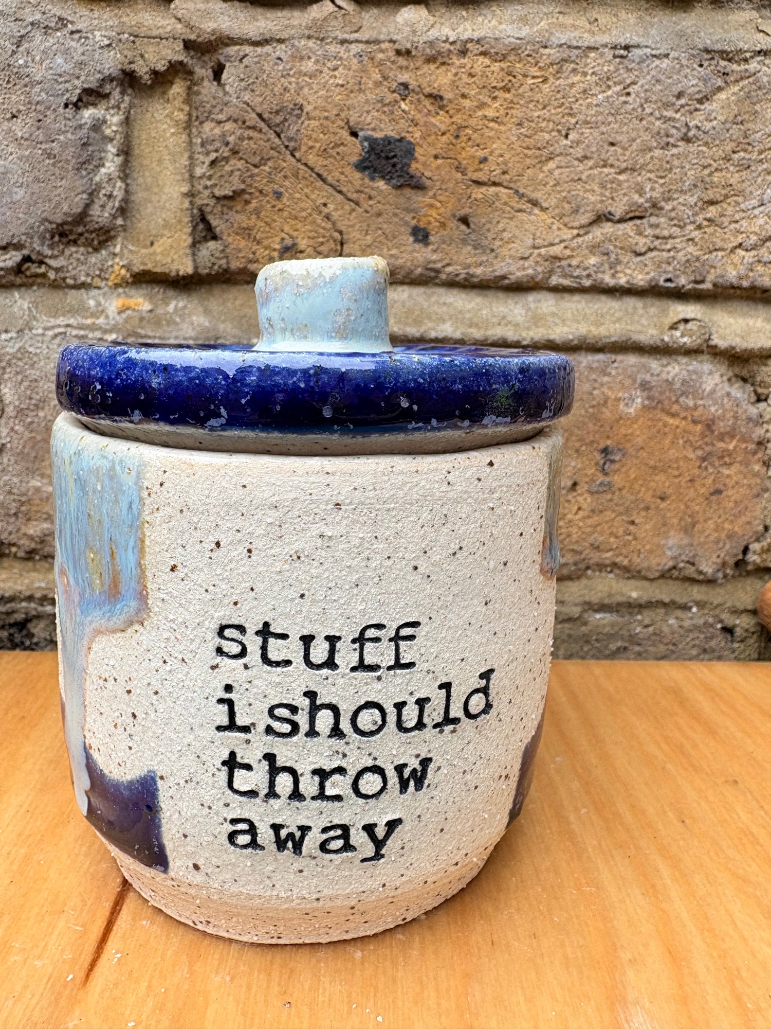 Gorgeous handmade lidded pot with knob imprinted with words “stuff i should throw away"
