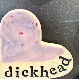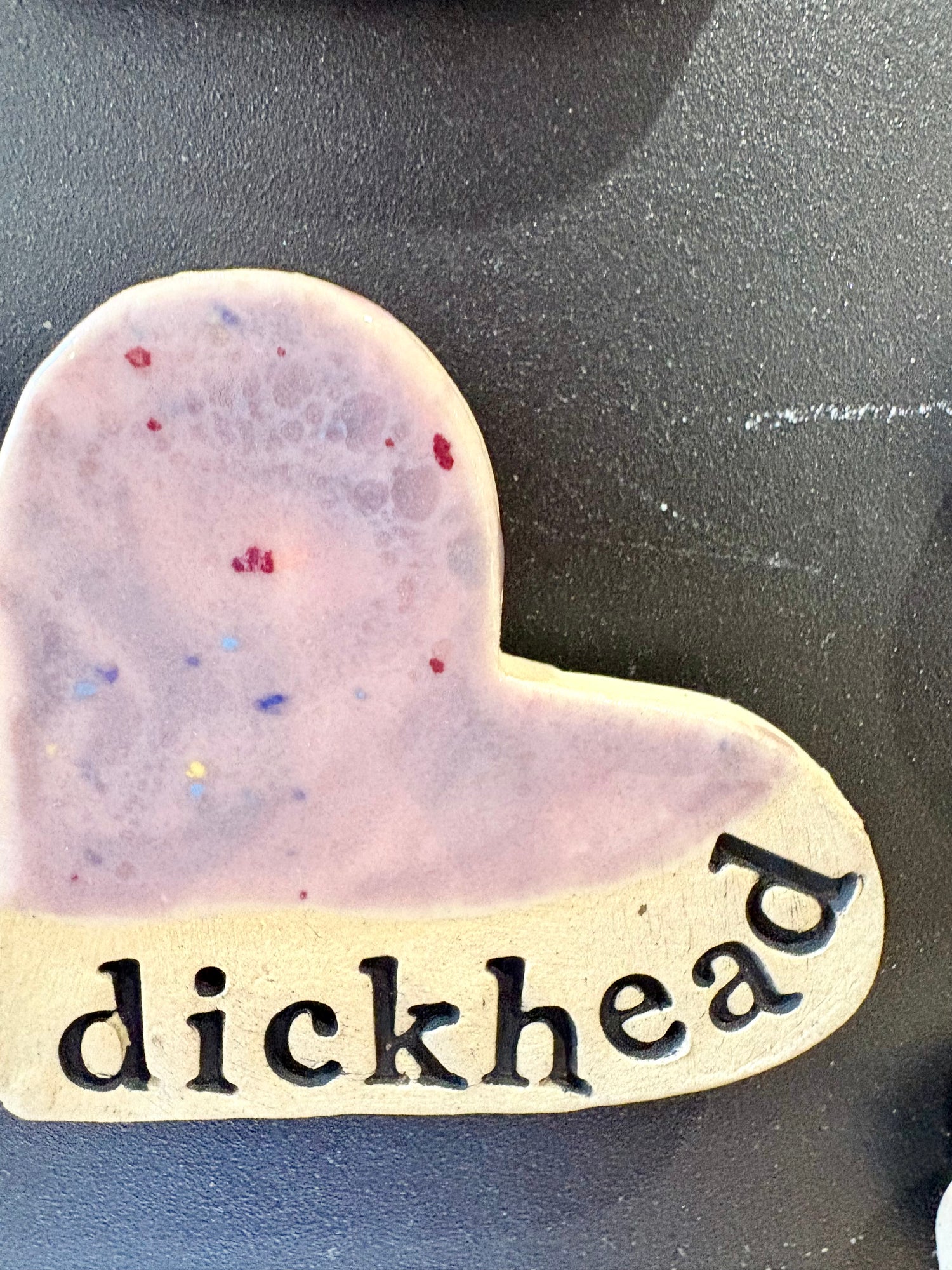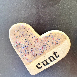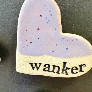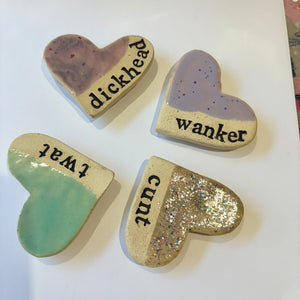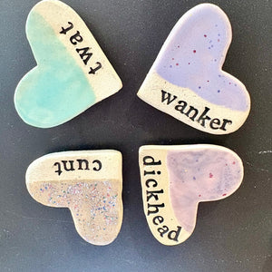 Set of 4 handmade sweary medium sized heart shaped magnets each imprinted with a rude insult