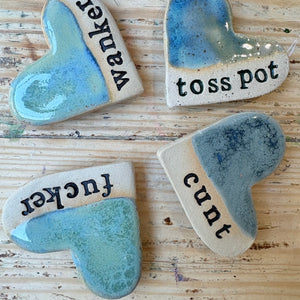 Set of 4 handmade sweary medium sized heart shaped magnets each imprinted with a rude insult