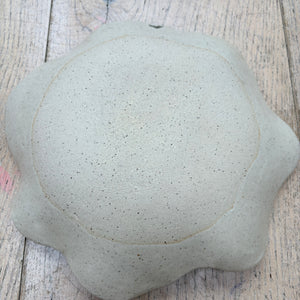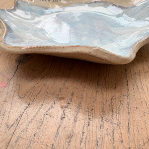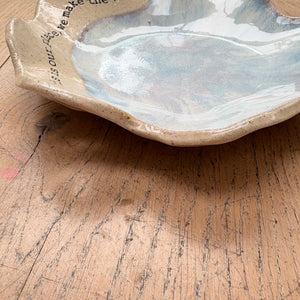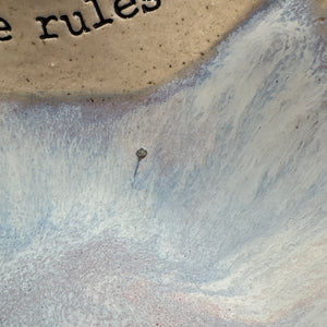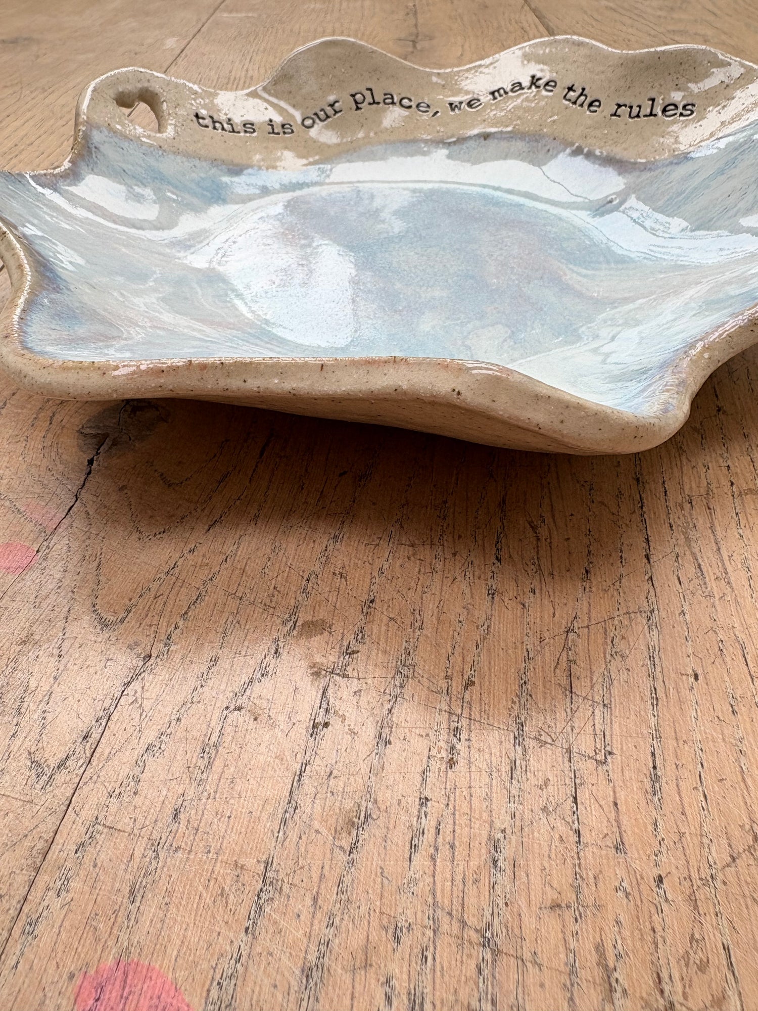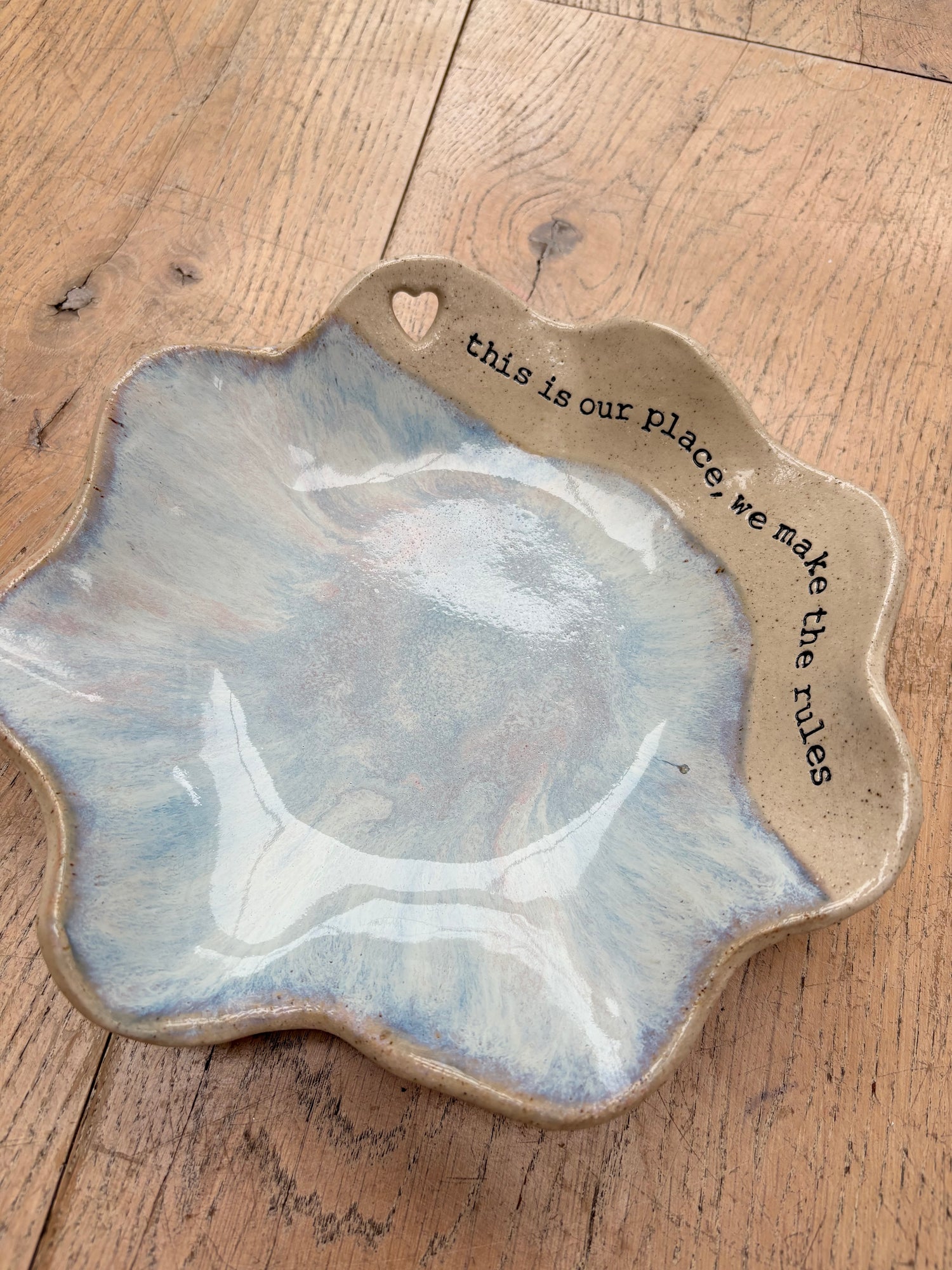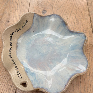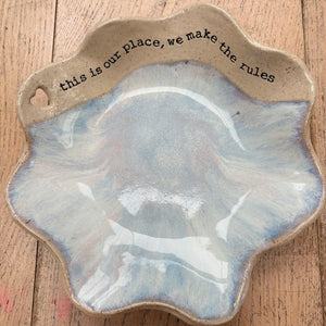 Handmade wavy edged bowl imprinted with "this is our place, we make the rules" on inside rim
