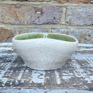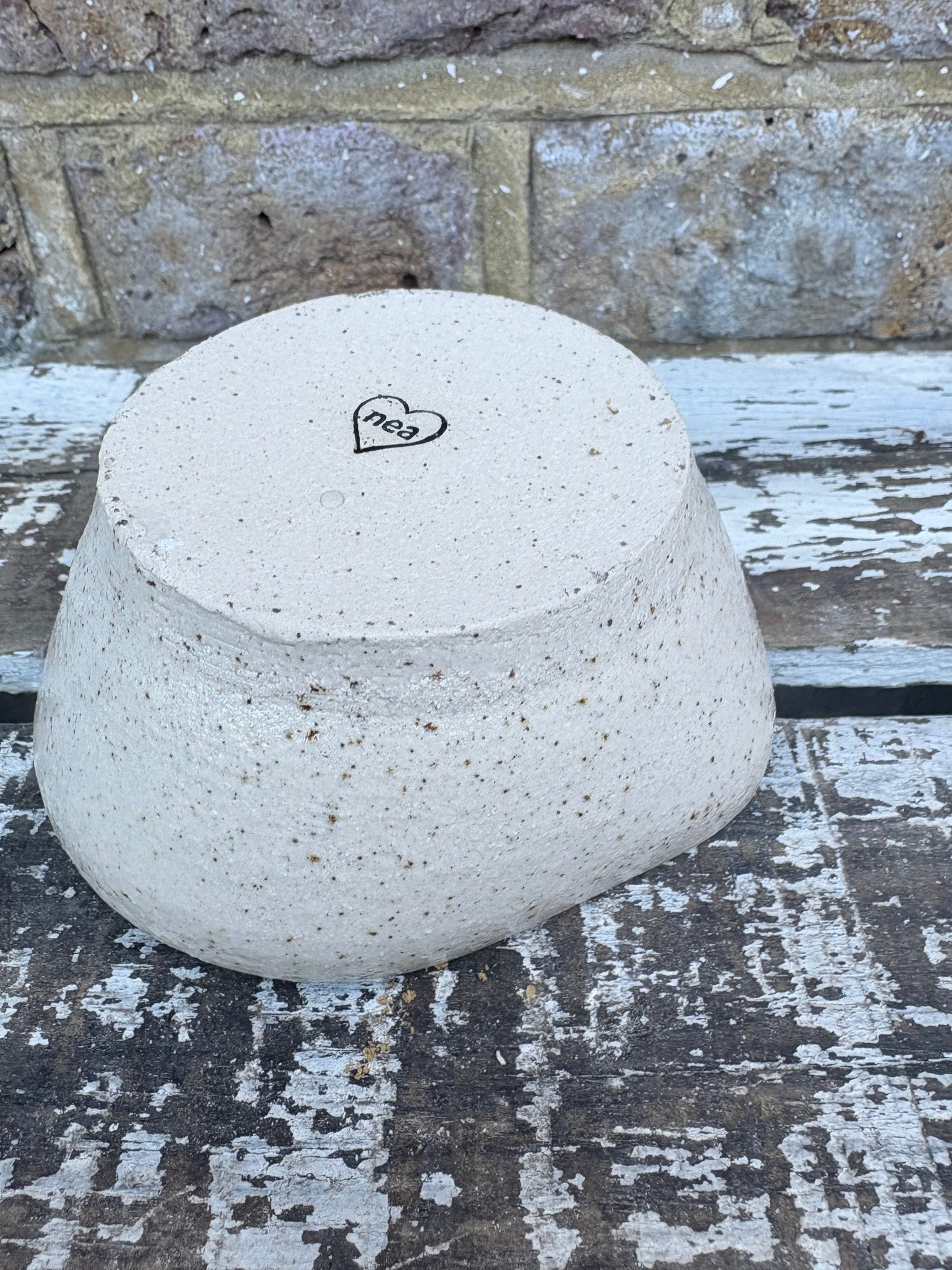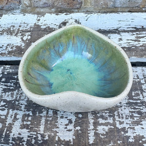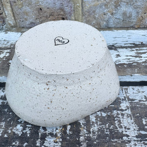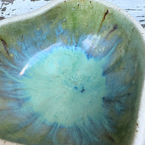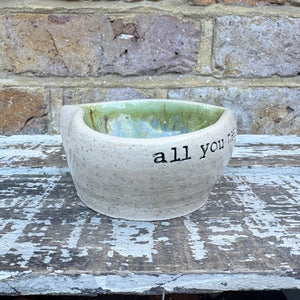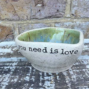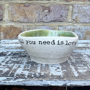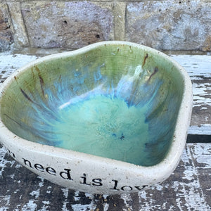 Handmade wheelthrown heart shaped snack bowl imprinted with "all you need is love"