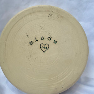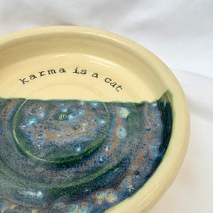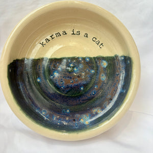 Cute imprint of "Karma is a cat" on front and "miaow" on base