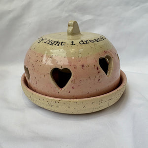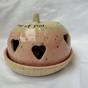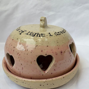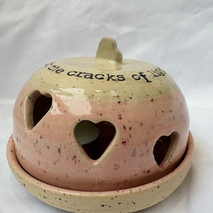Gorgeous round ceramic tea light holder with heart shaped cut-outs which allow the light from the candle to shine through