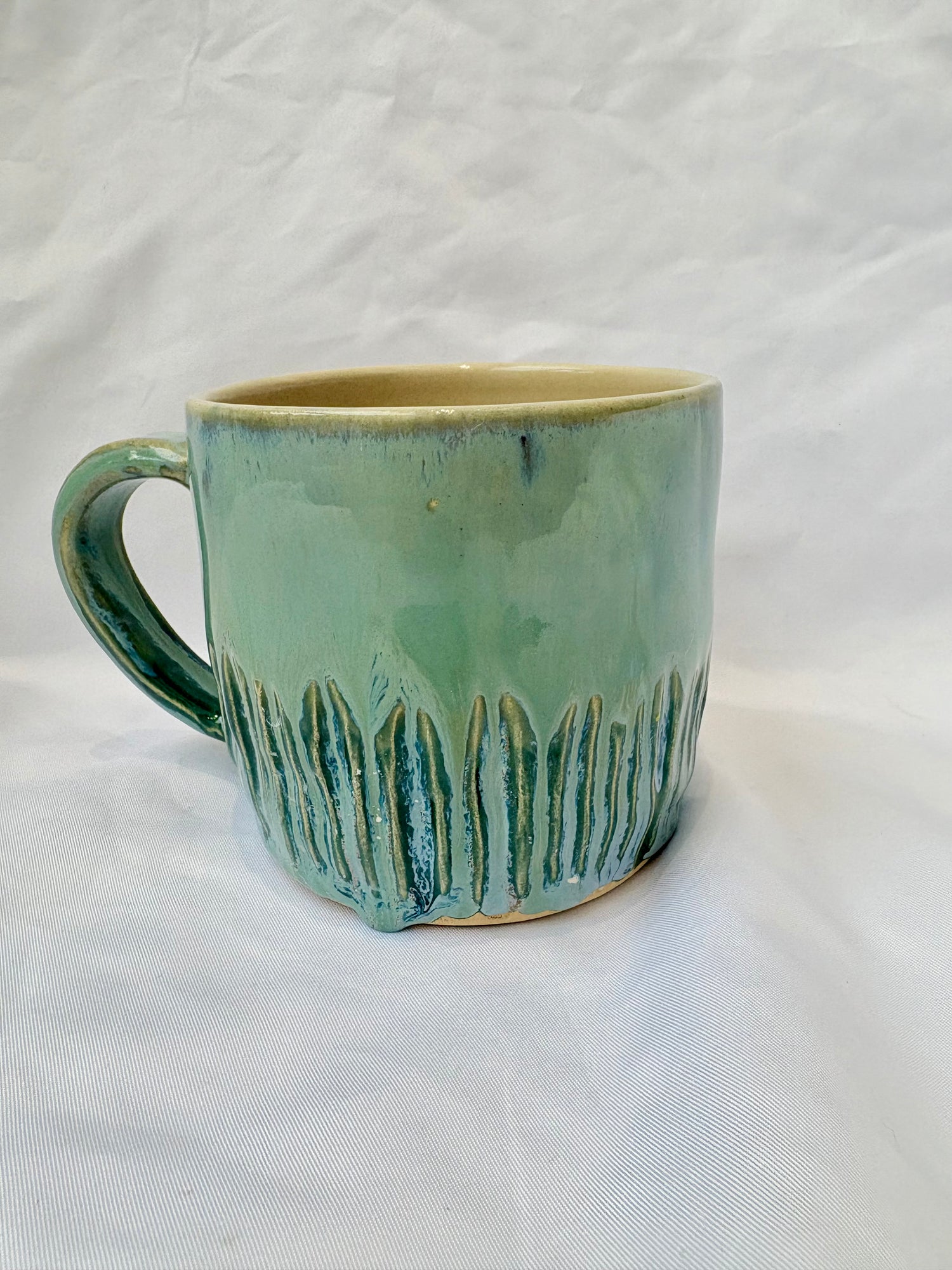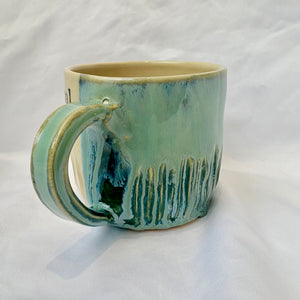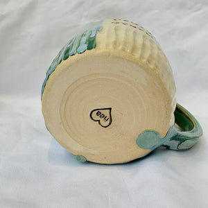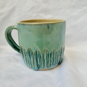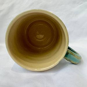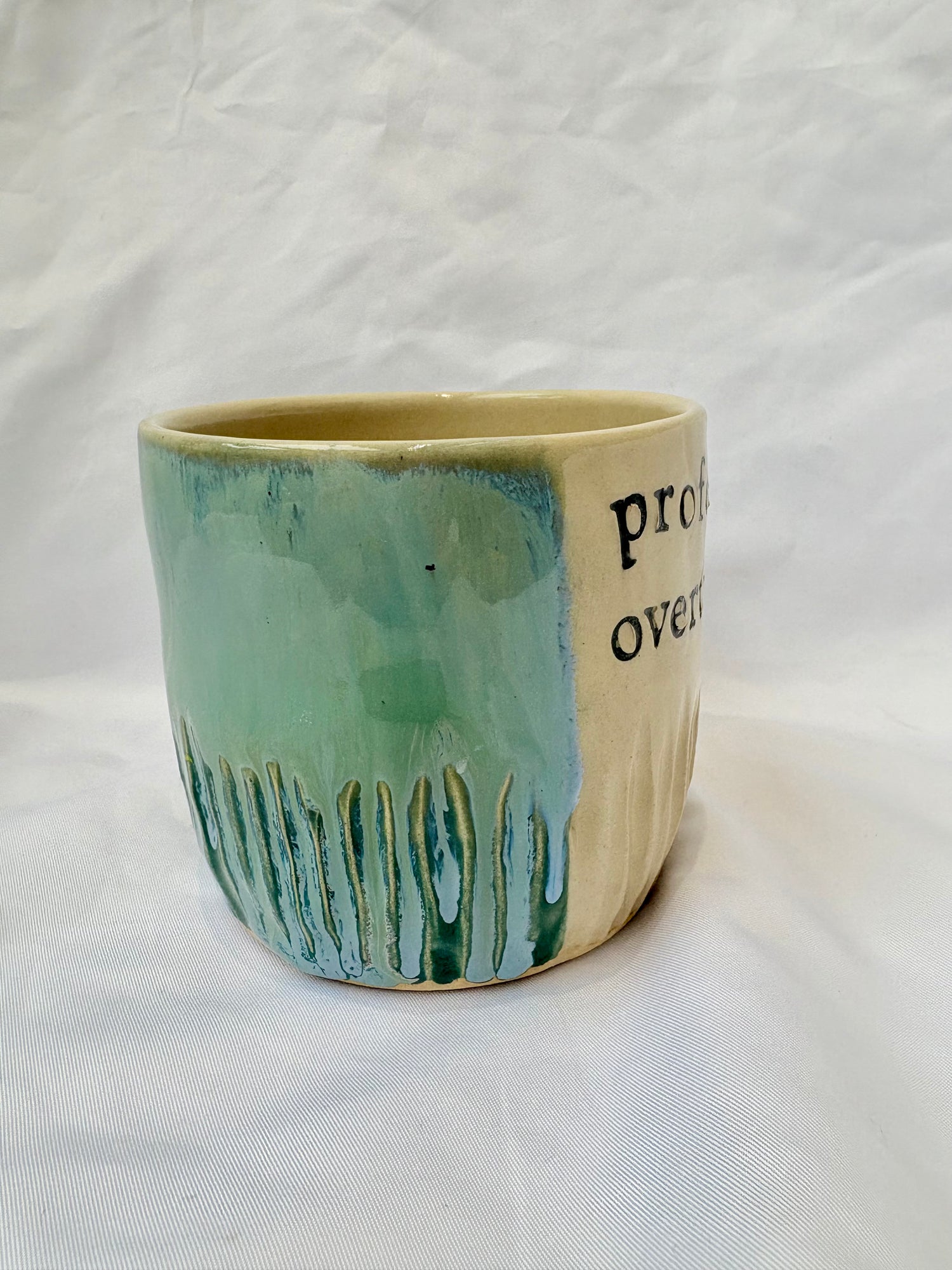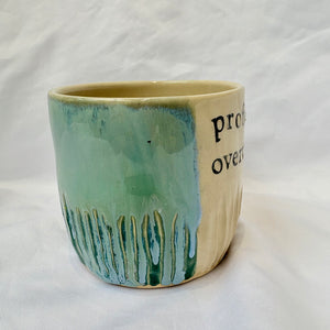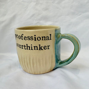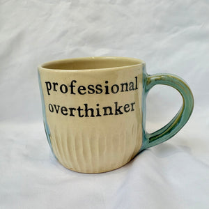 "professional overthinker" wheelthrown mug made with toasty flecked stoneware clay and glazed in ocean green