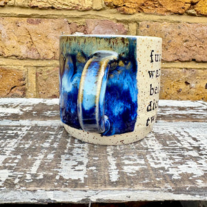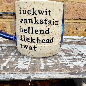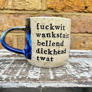 "bellend fuckwit dickwad dipshit wanker" mug (Antique Blues)