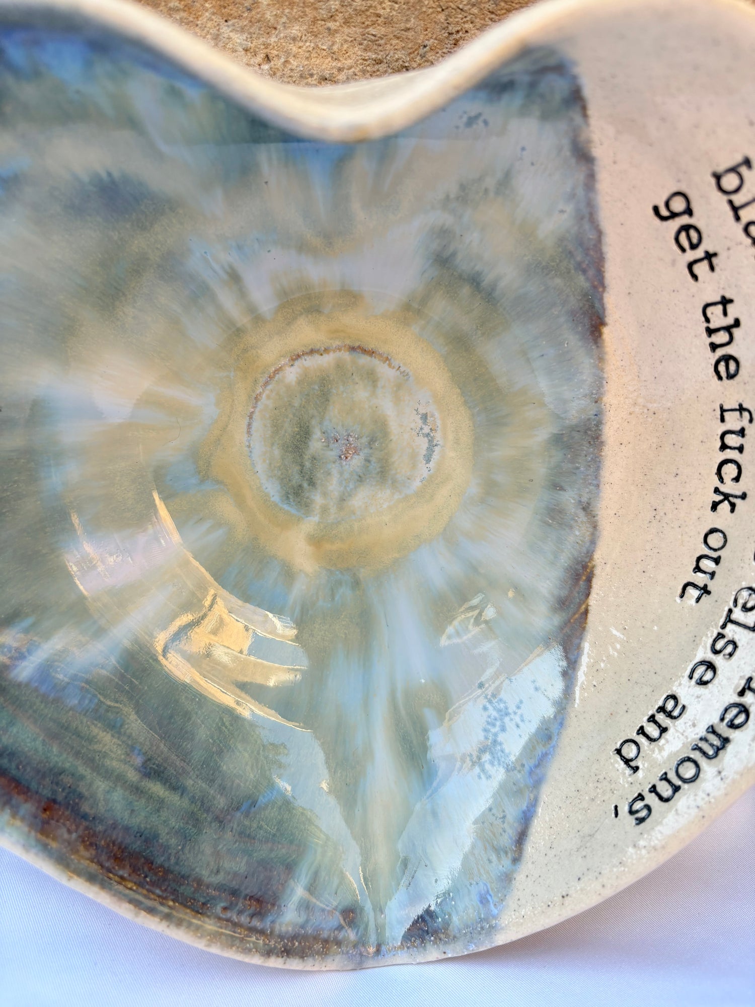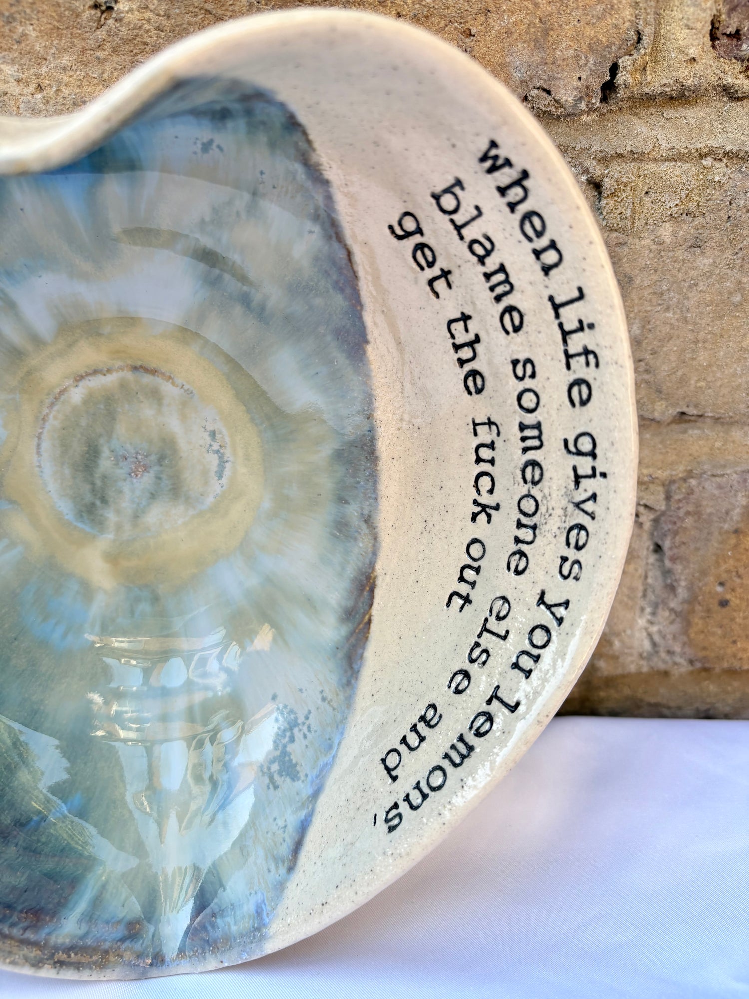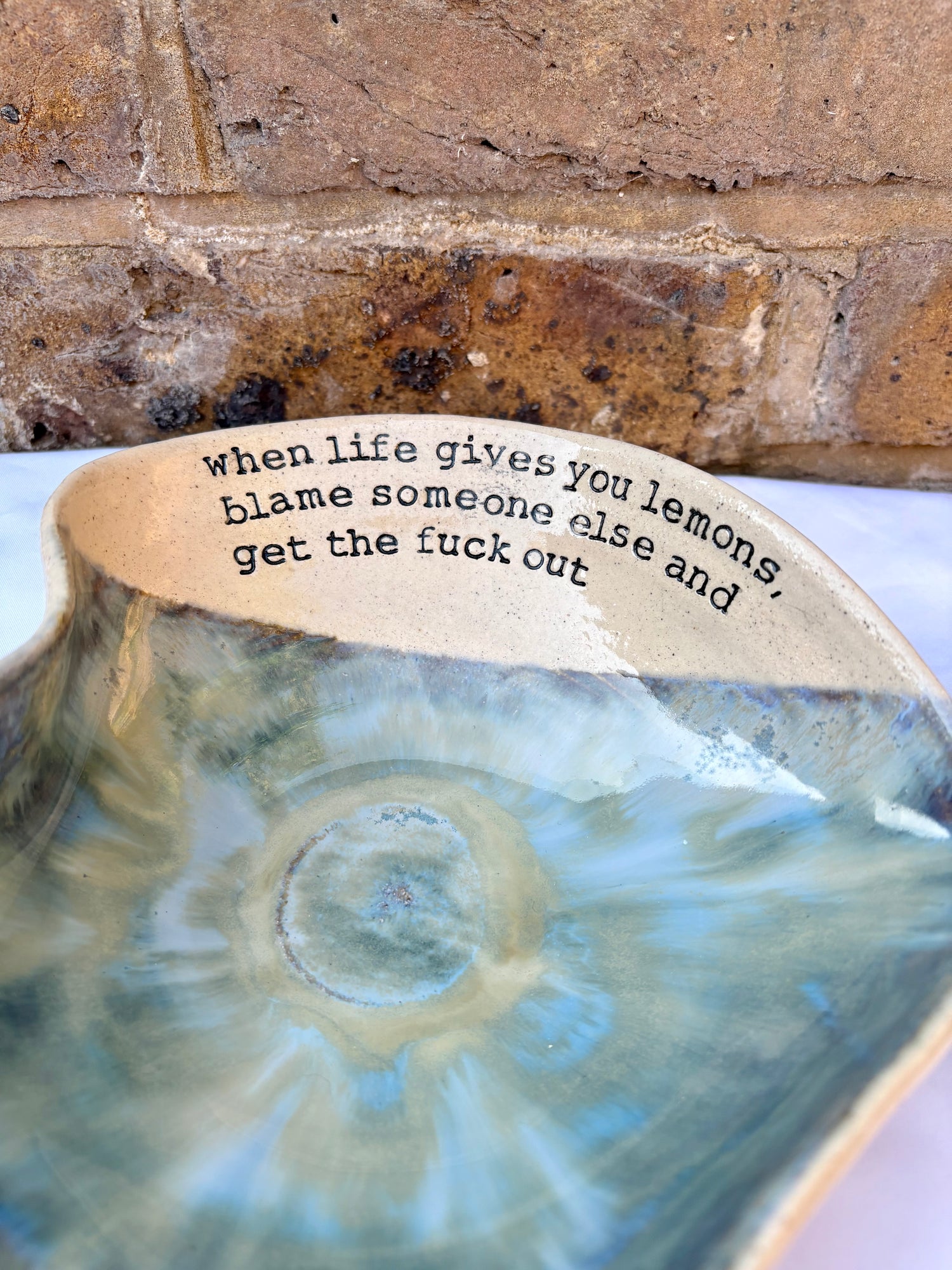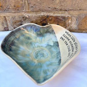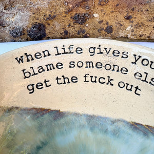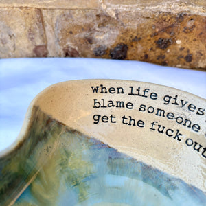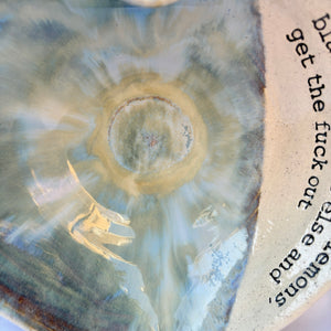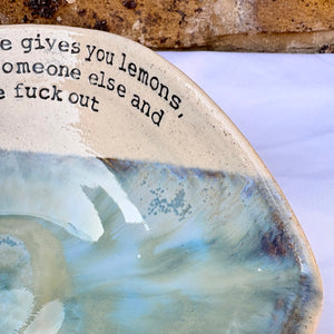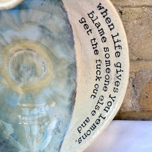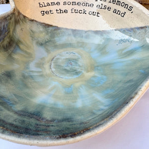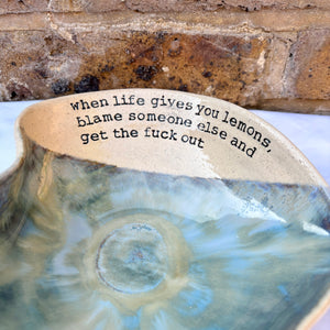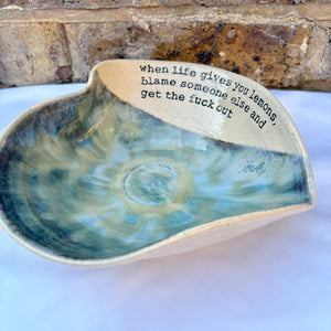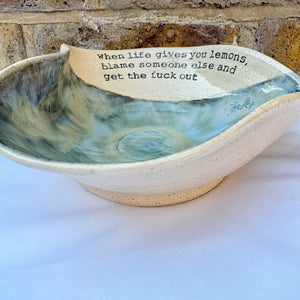 Wheelthrown heart shaped bowl imprinted with "when life gives you lemons, blame someone else and get the fuck out" on inside rim