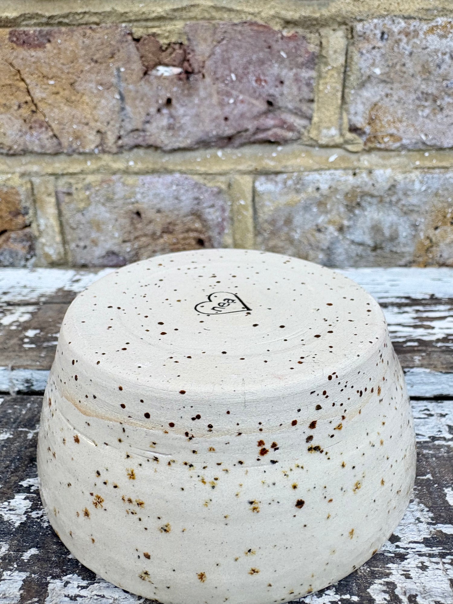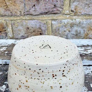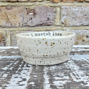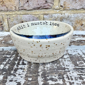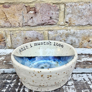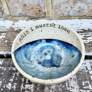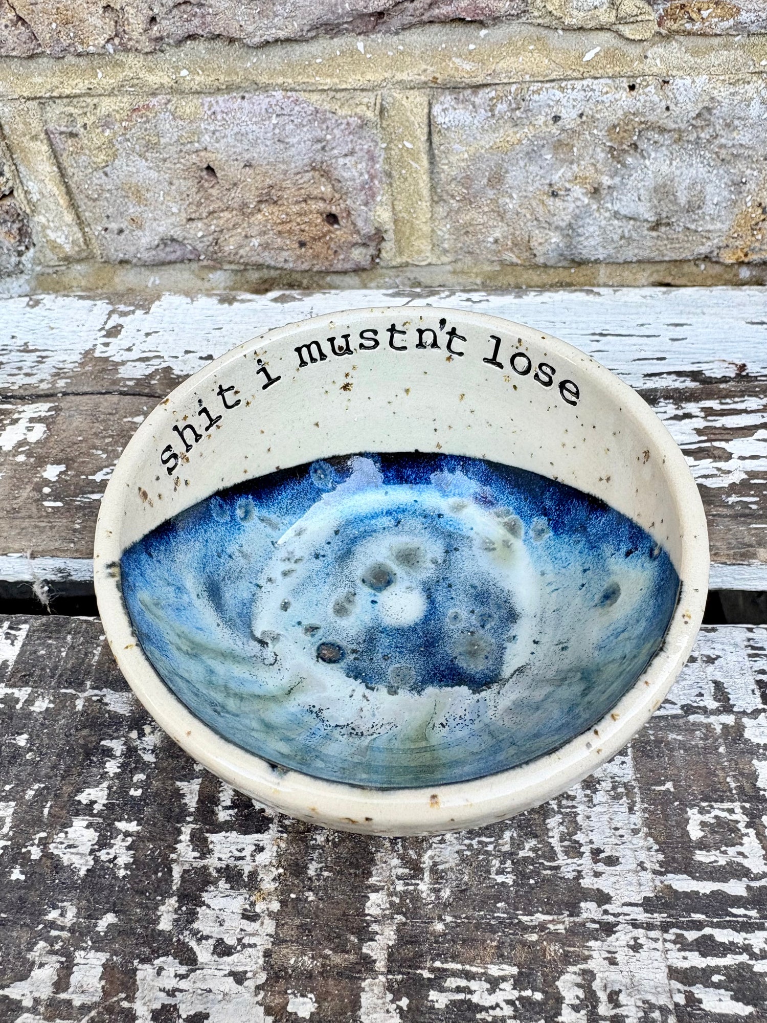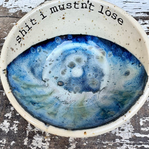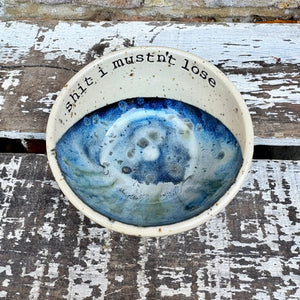Gorgeous handmade wheelthrown trinket dish imprinted with words “shit I mustn't lose"