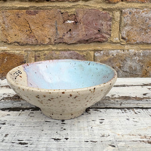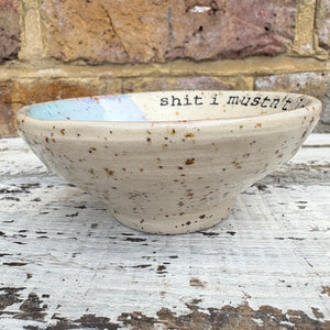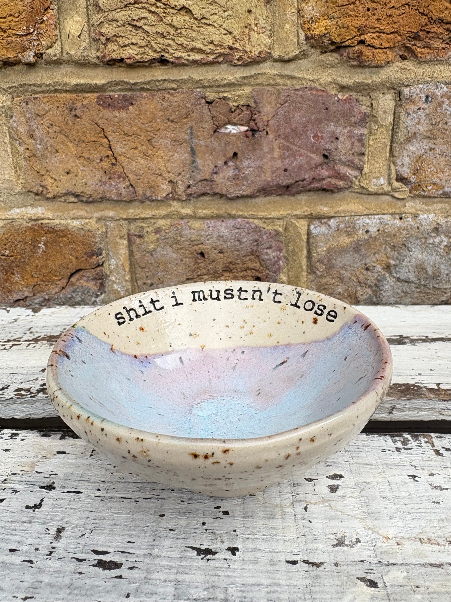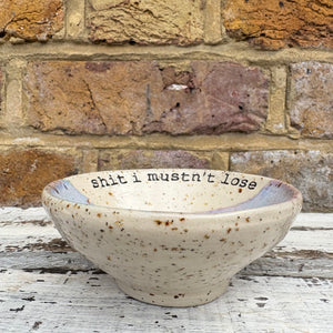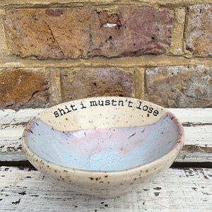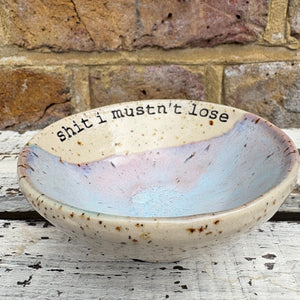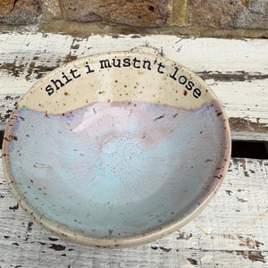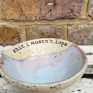 Gorgeous handmade wheelthrown trinket dish imprinted with words “shit I mustn't lose"