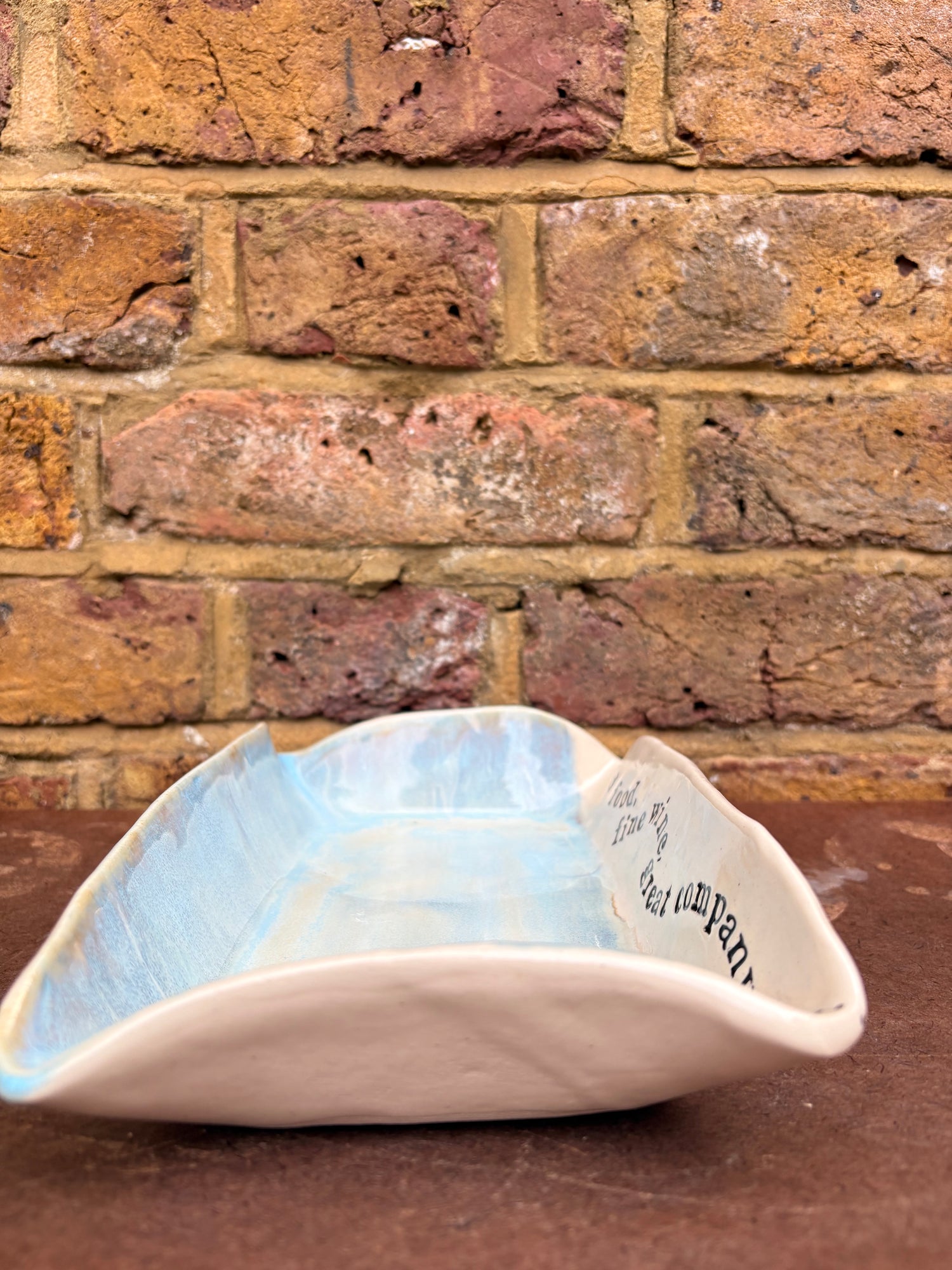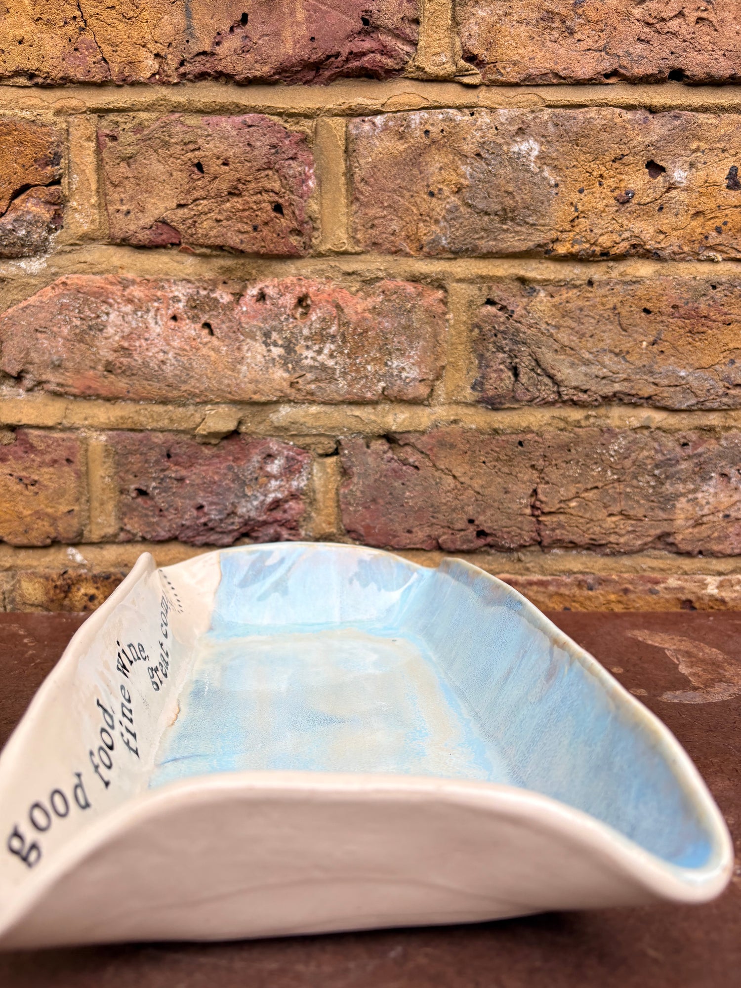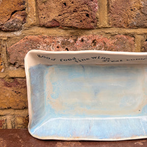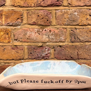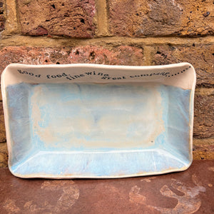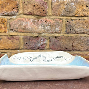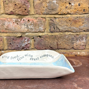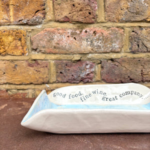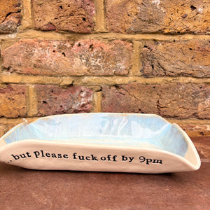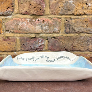 Beautiful rectangular serving/salad dish imprinted with "good food, fine wine, great company..." on the inside rim, and "......but please fuck off by 9pm" on outside rim