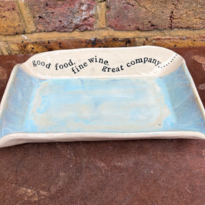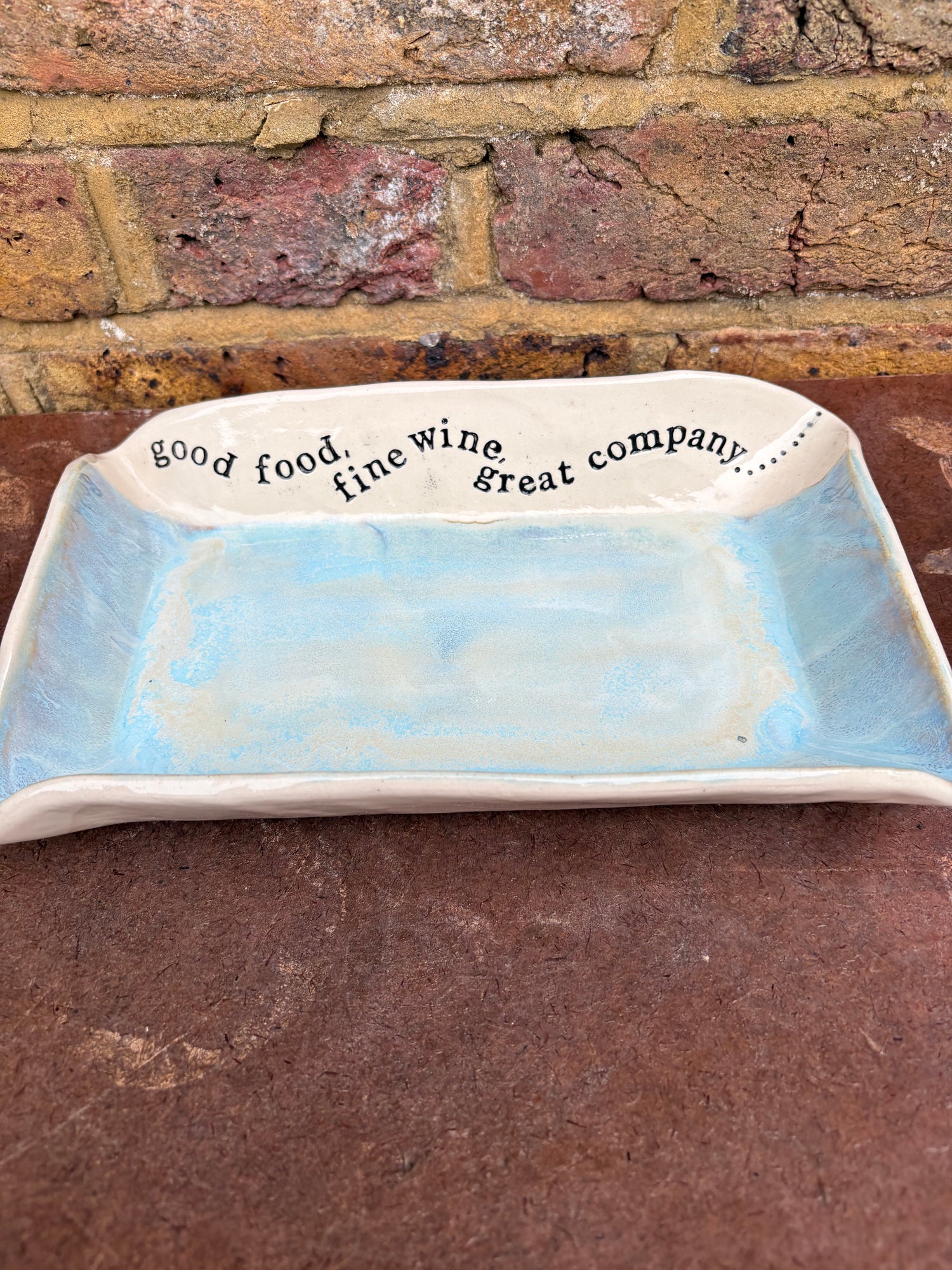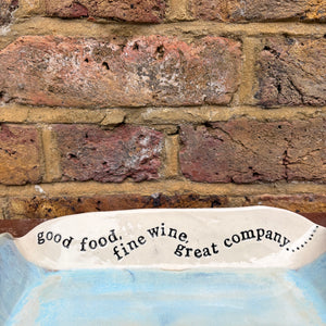 “good food, fine wine, great company..." rectangular salad/serving dish