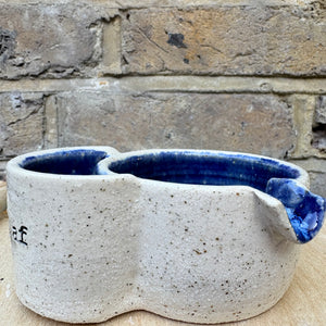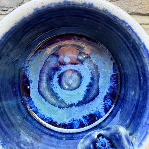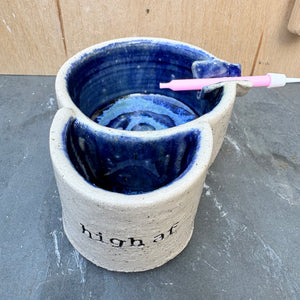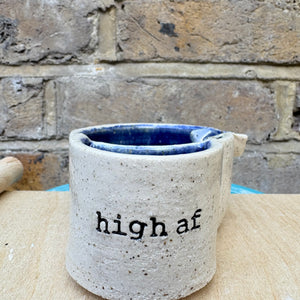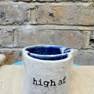 Glazed in Deep Blue and imprinted with funny message "high af"