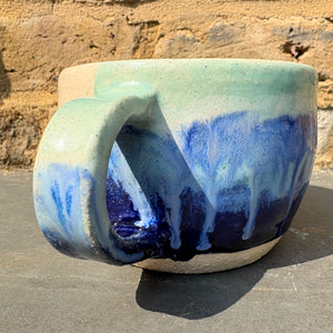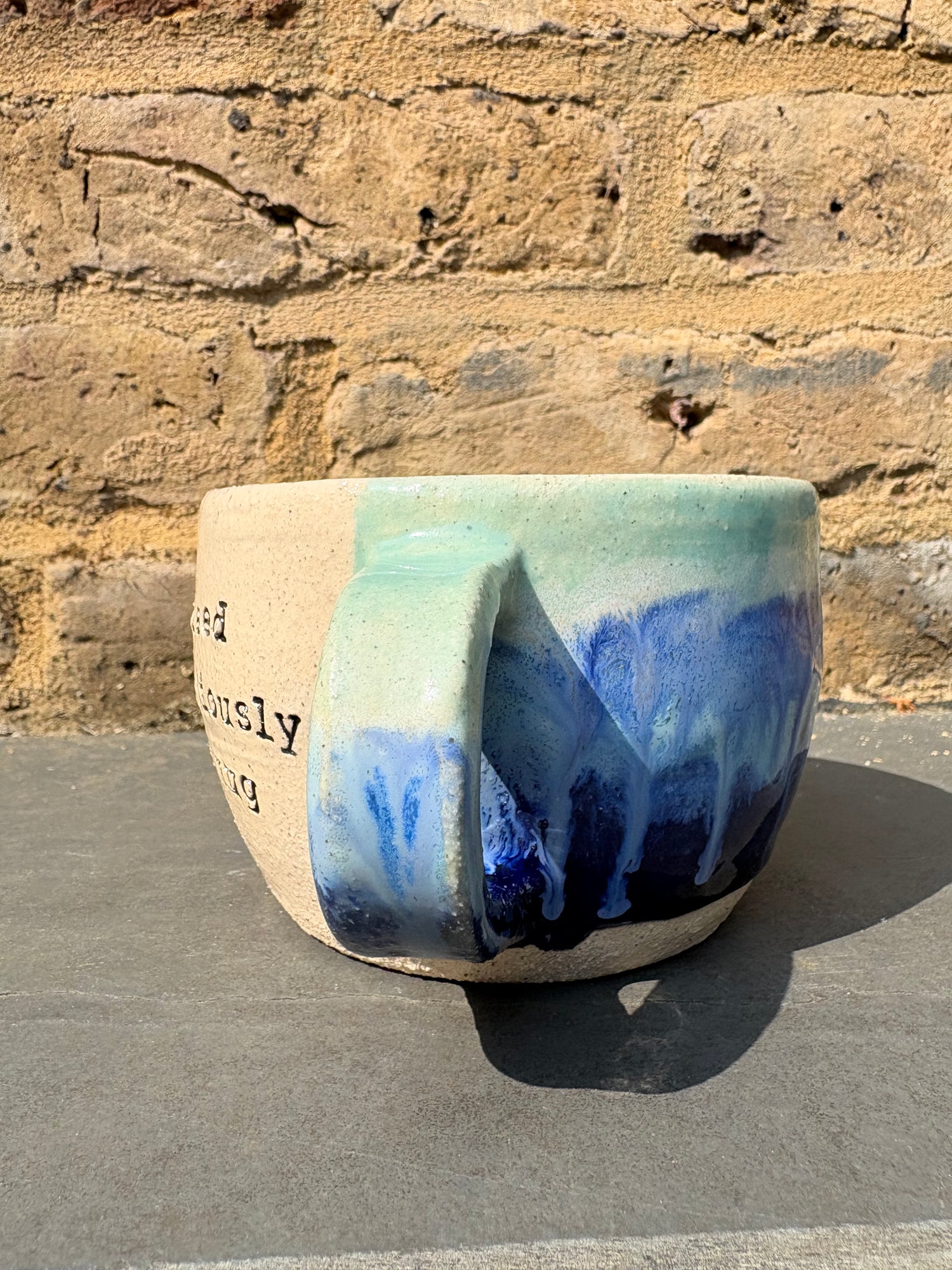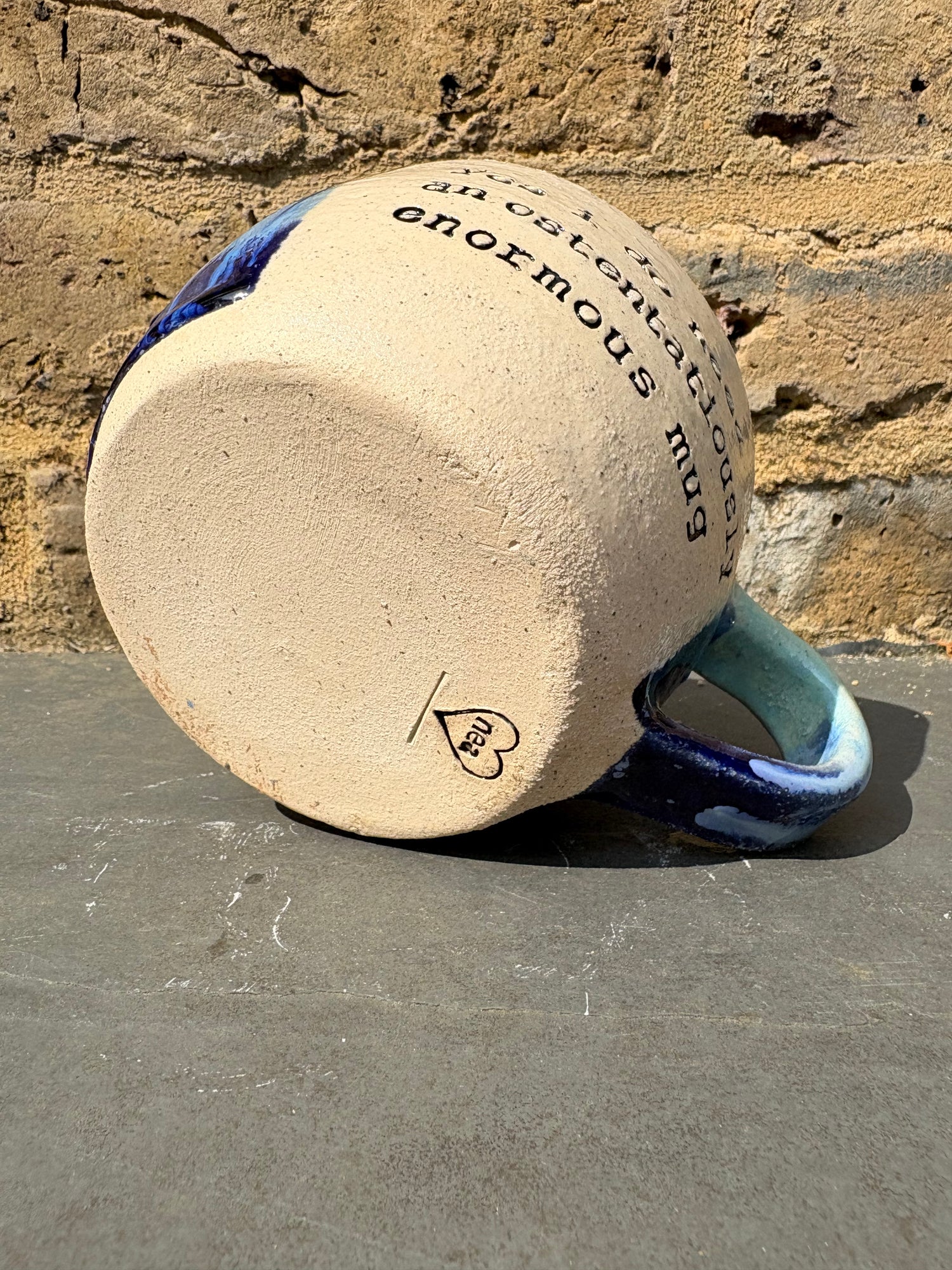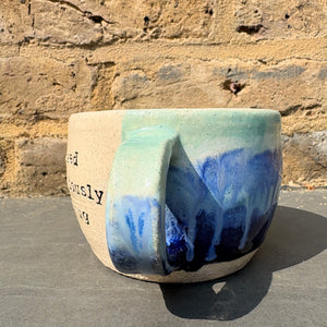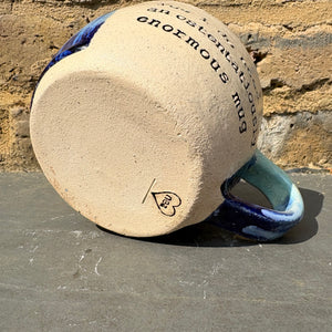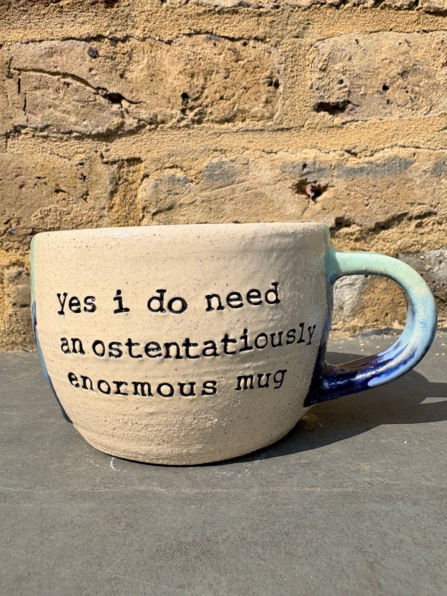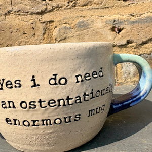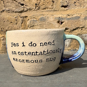 Gorgeous wheelthrown mug imprinted with "Yes I do need an ostentatiously enormous mug" on side