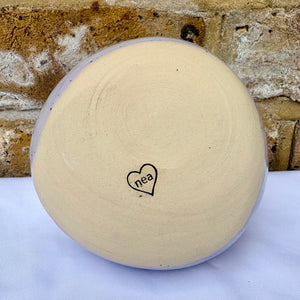 Wheelthrown salt pig imprinted with "i'm a very salty piggy" on inside