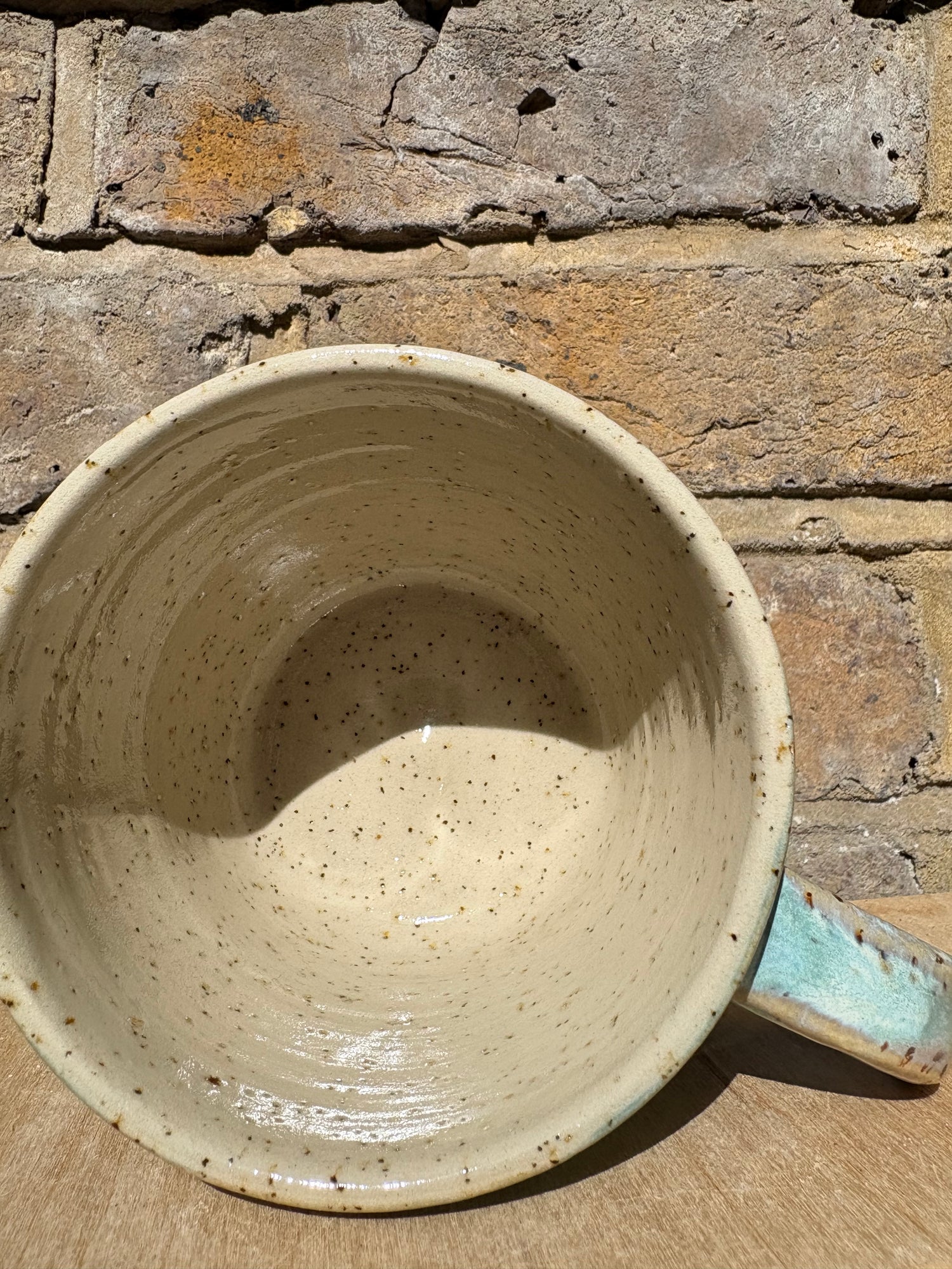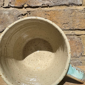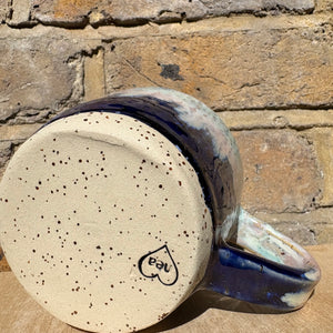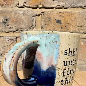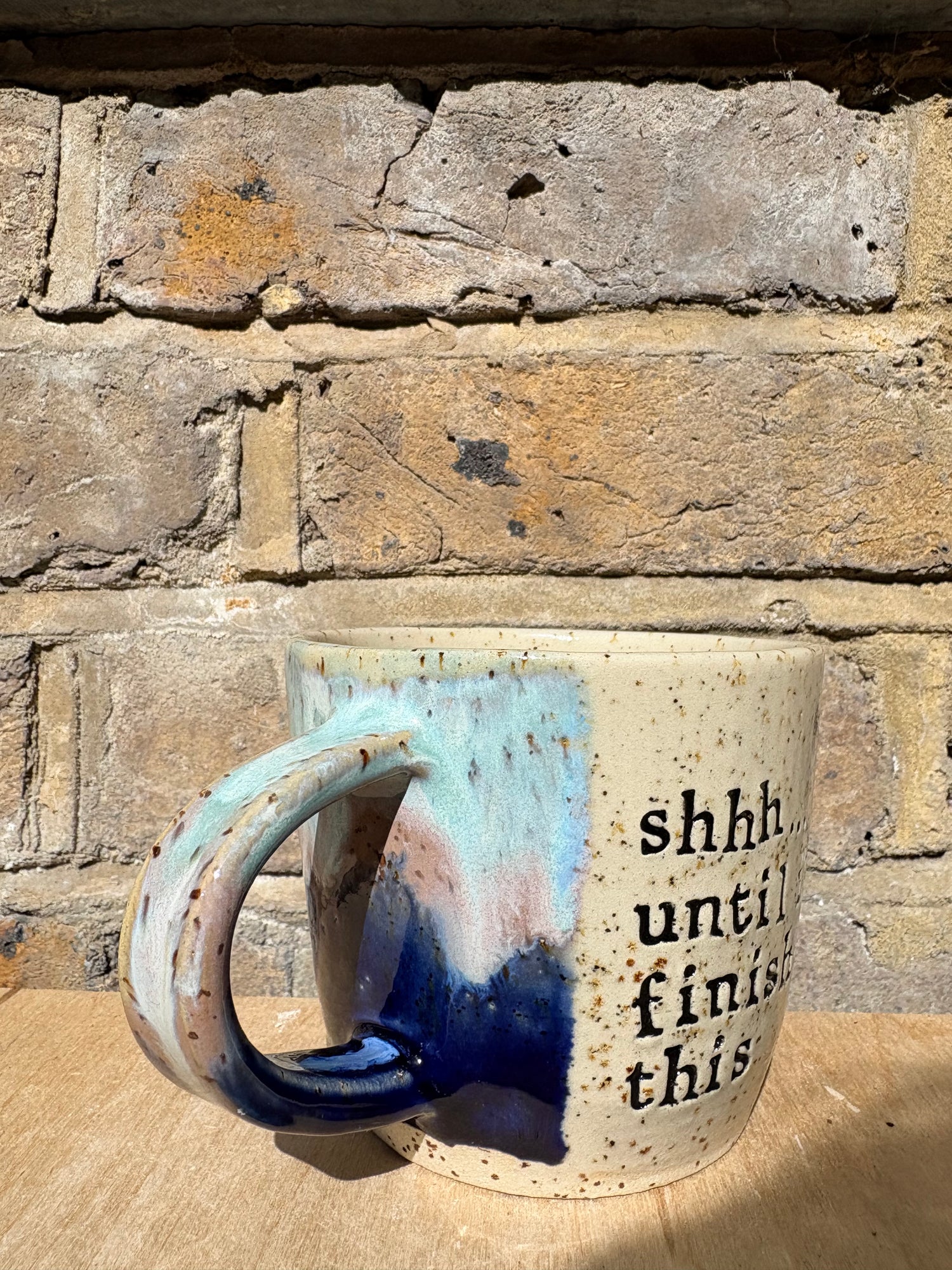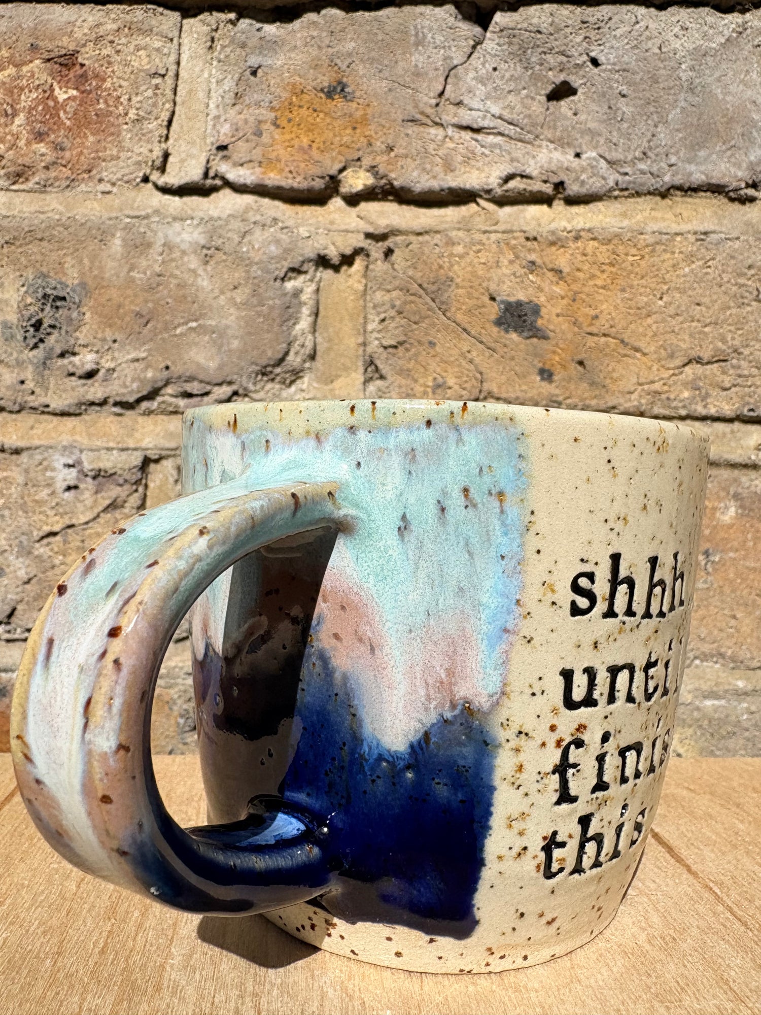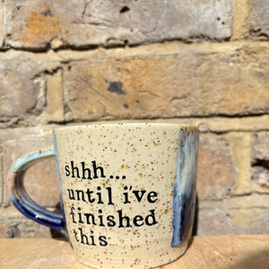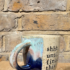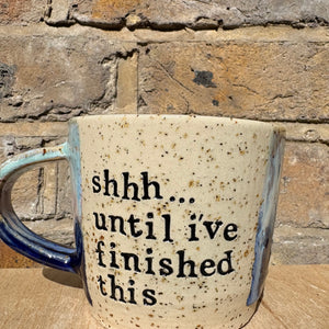 Wheelthrown mug imprinted with "shhh...until i finish this" on side