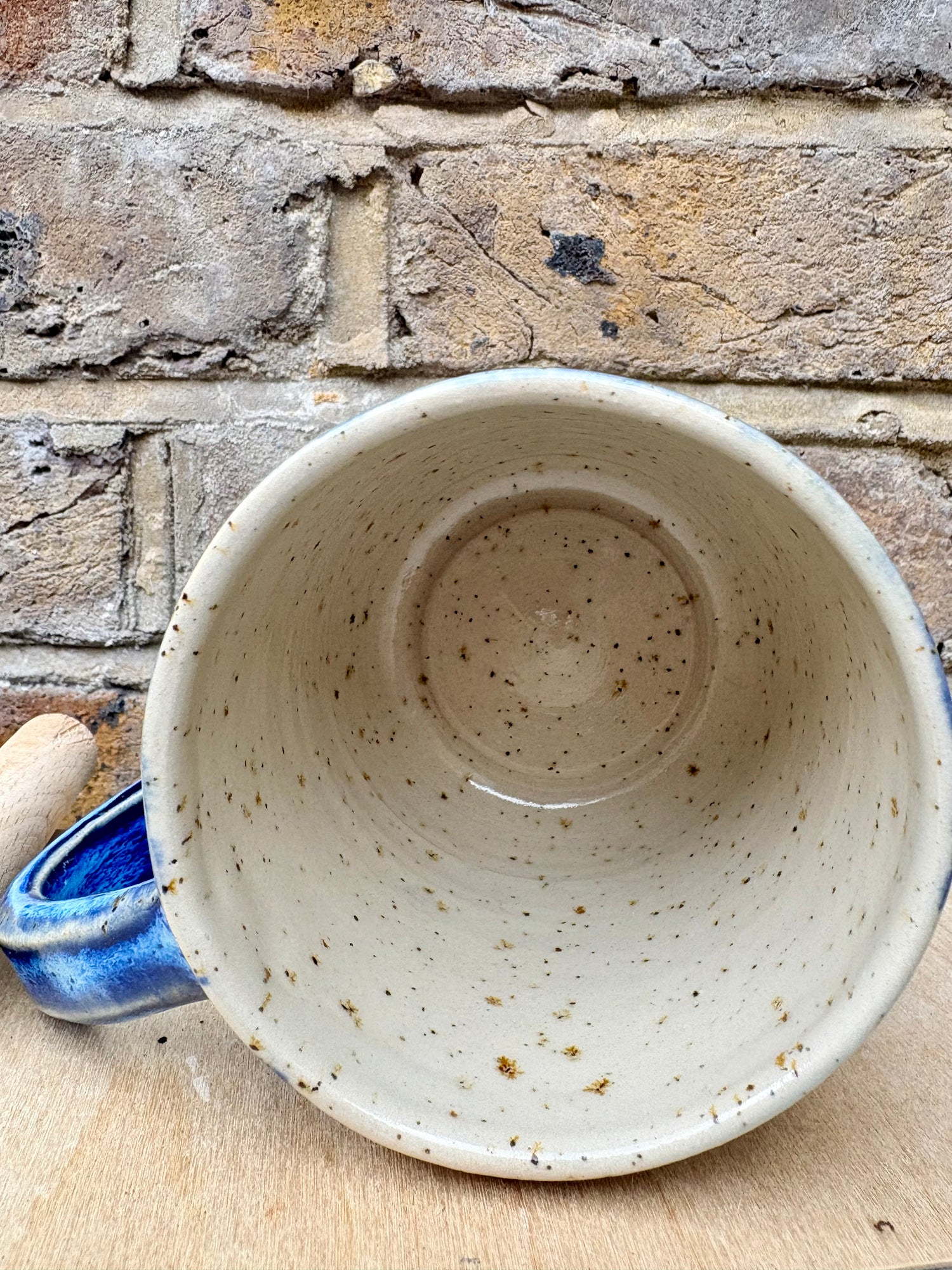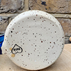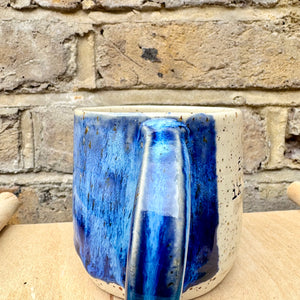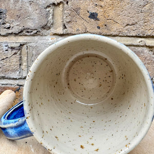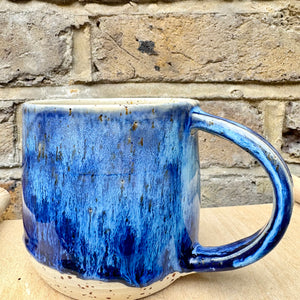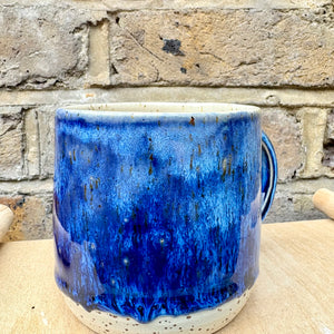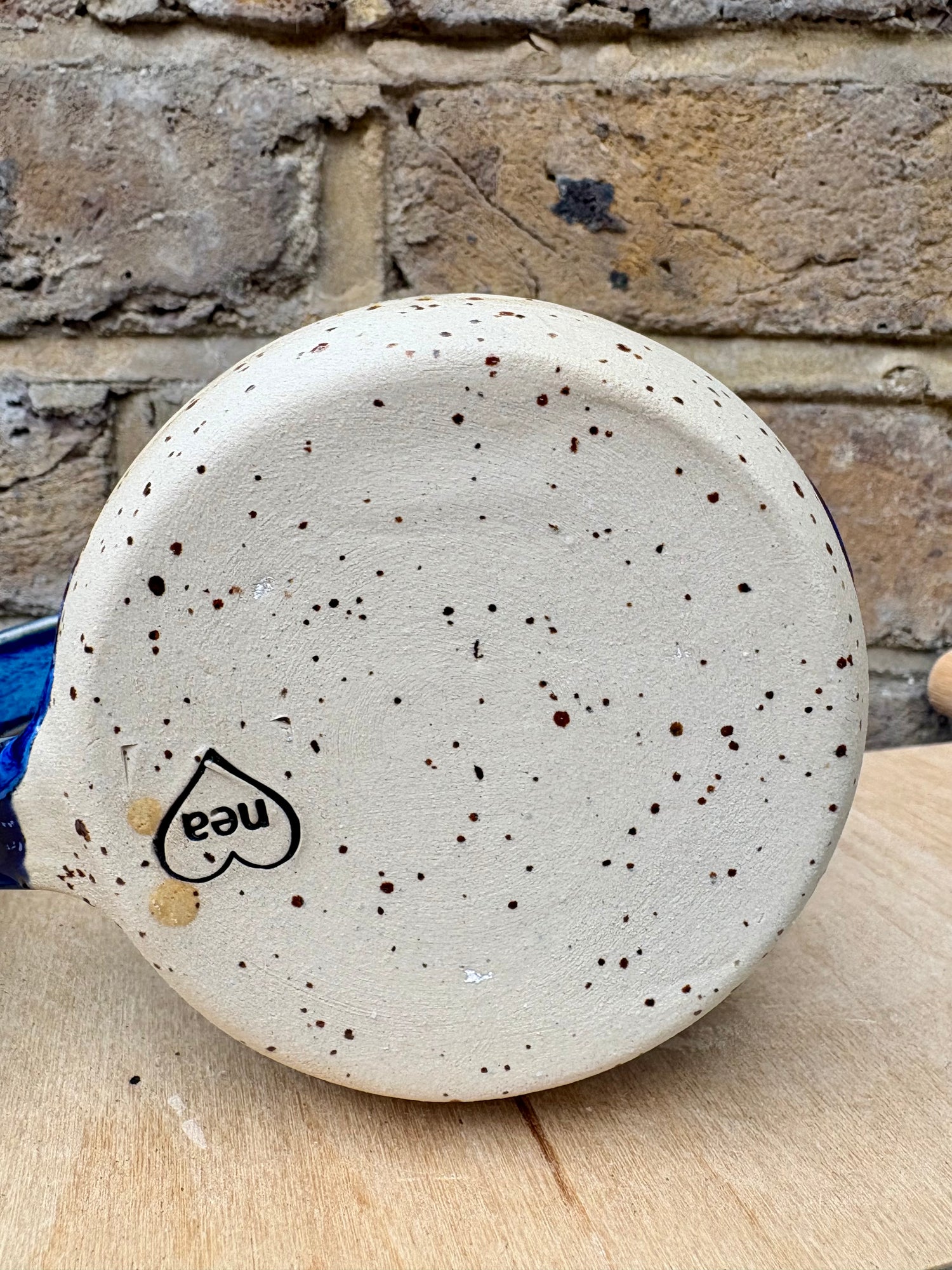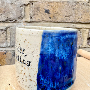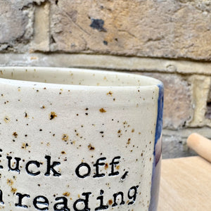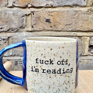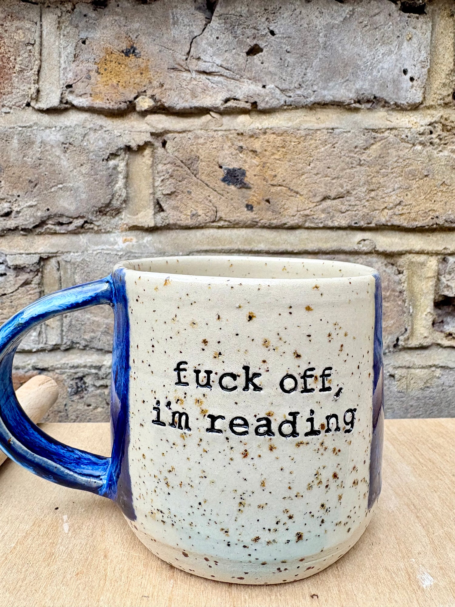 Deep Blue glaze and imprinted with words "fuck off i'm reading"