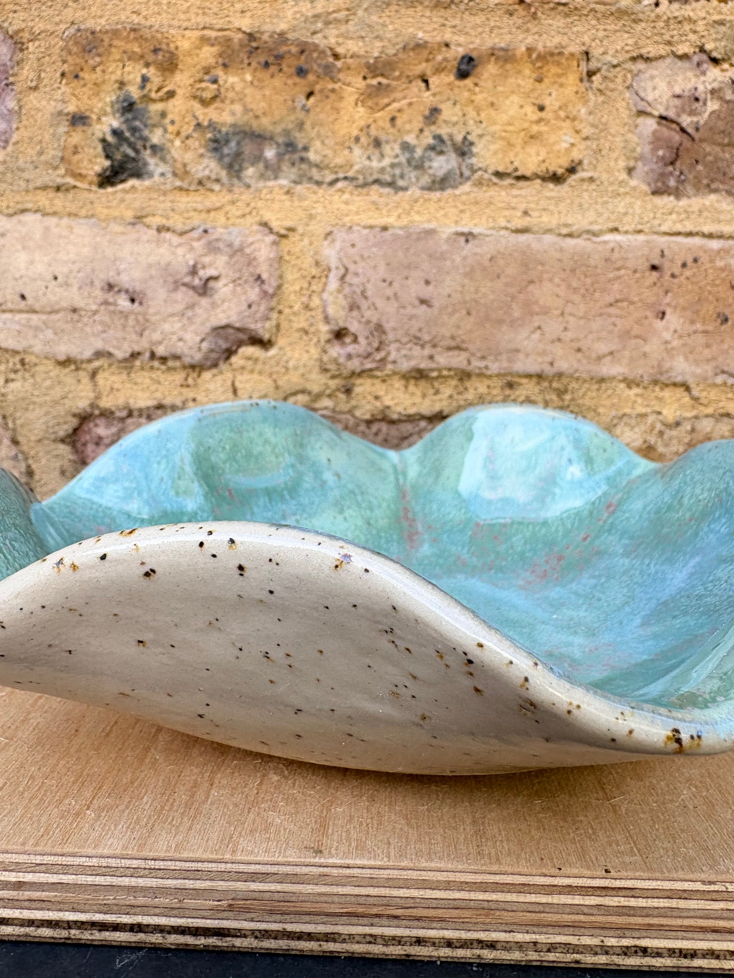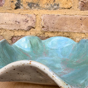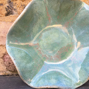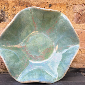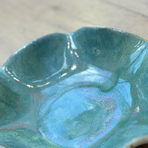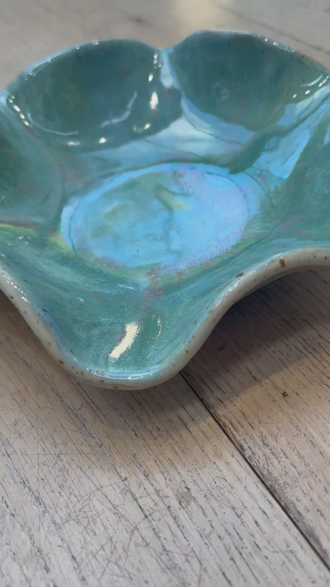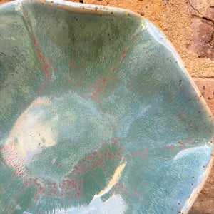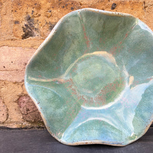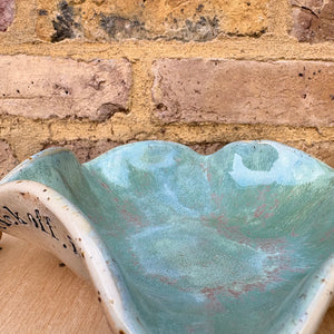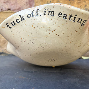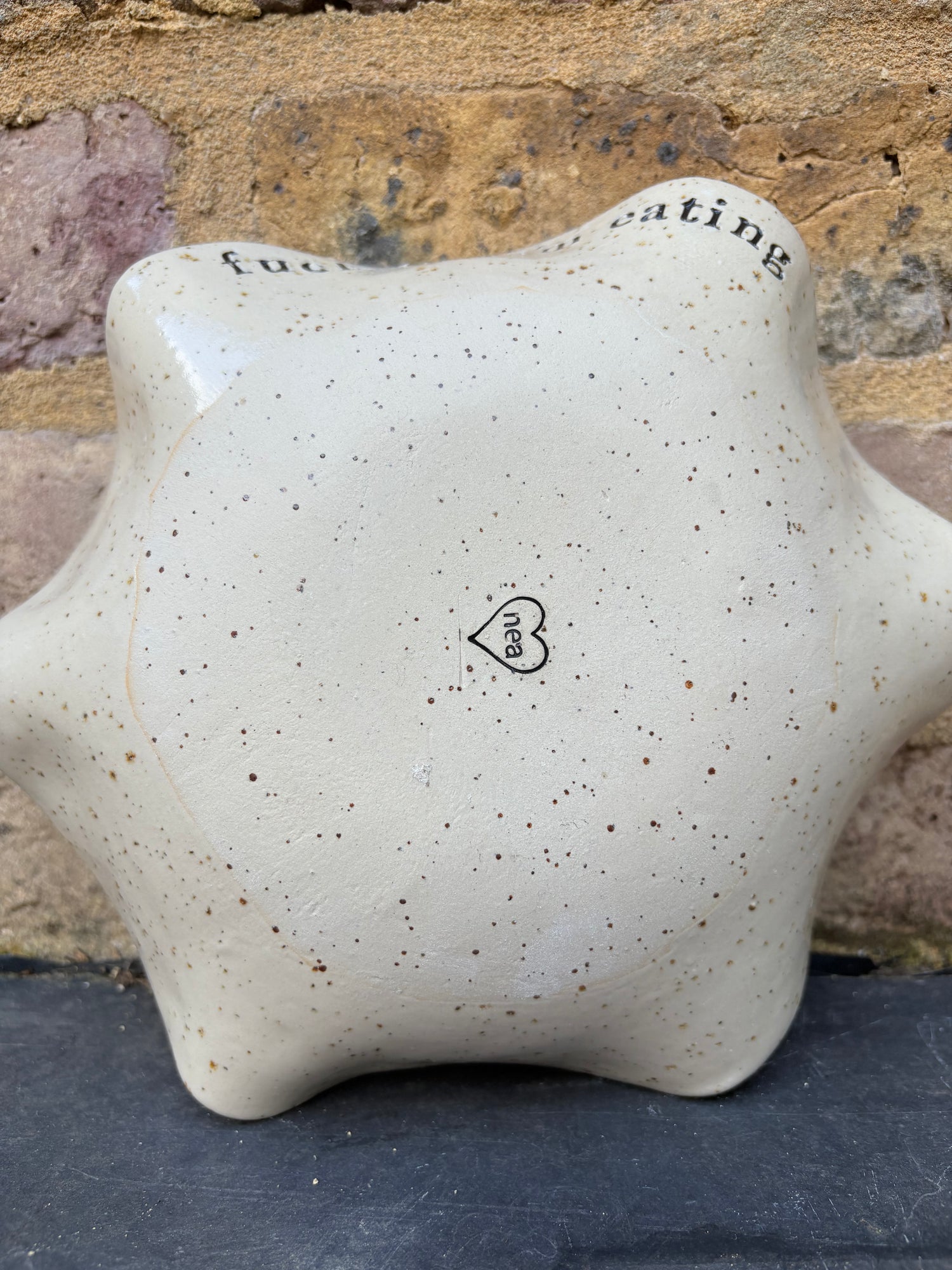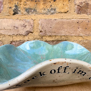 Flower shaped dish imprinted with "fuck off, i'm eating" on the outside rim