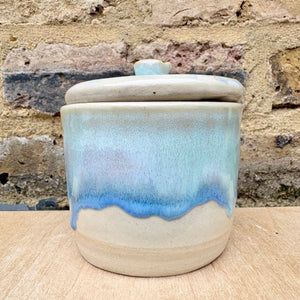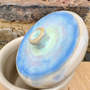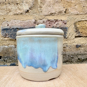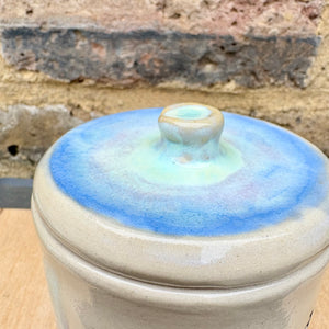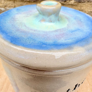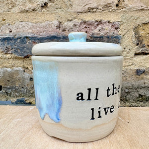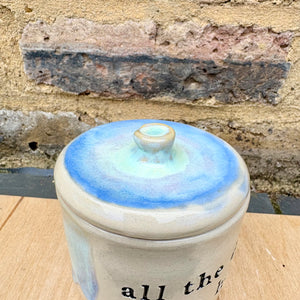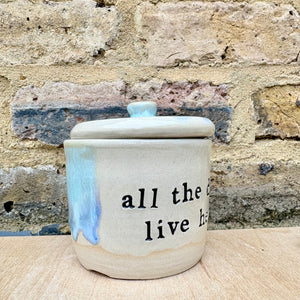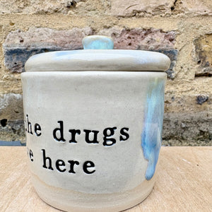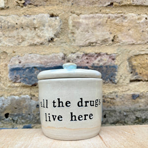 Gorgeous handmade lidded pot with knob imprinted with words "all the drugs live here"